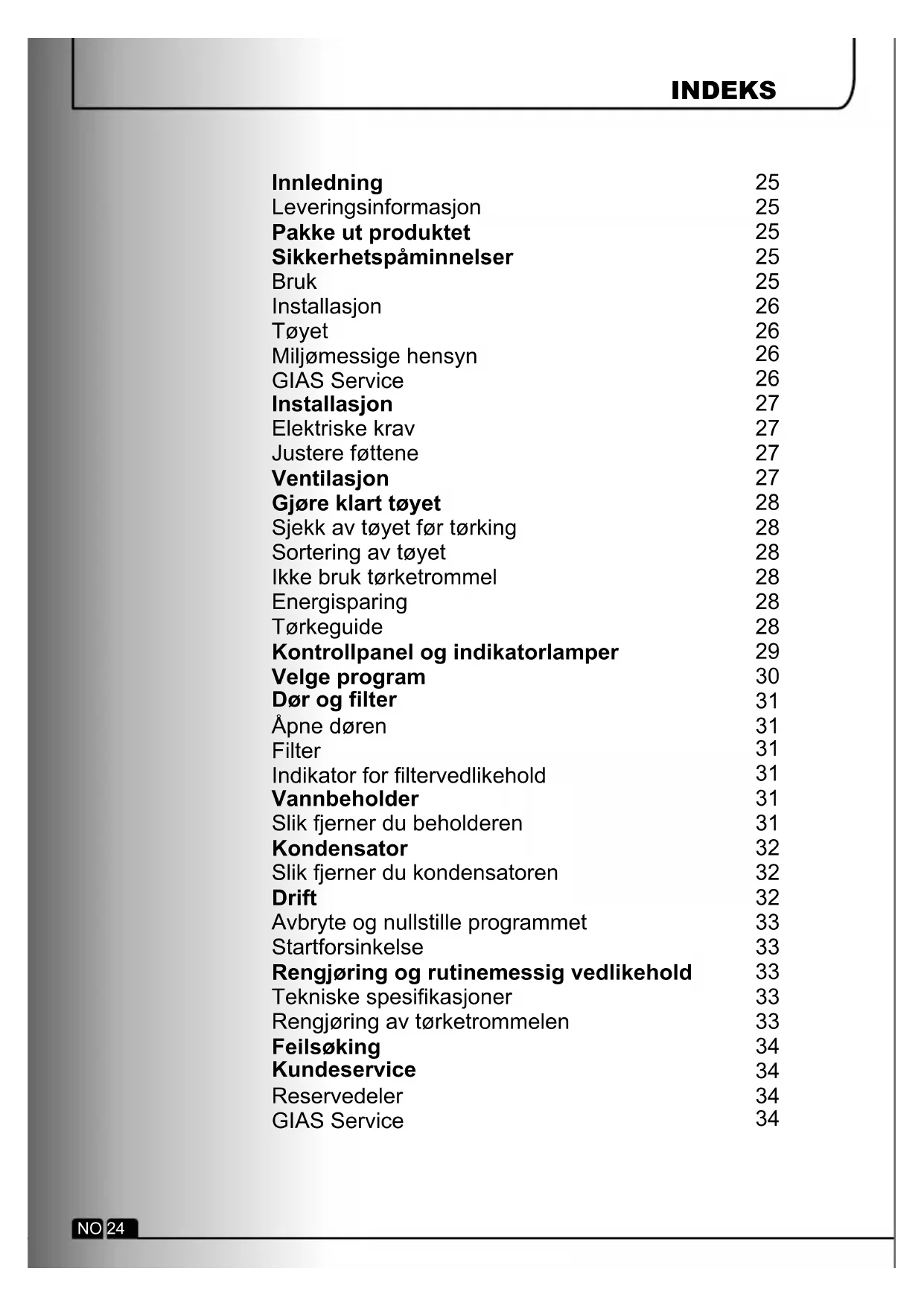 Innledning Leveringsinformasjon Pakke ut produktet Sikkerhetspåminnelser Bruk Installasjon Tøyet Miljømessige hensyn GIAS Service Installasjon Elektriske krav Justere føttene Ventilasjon Gjøre klart tøyet Sjekk av tøyet før tørking Sortering av tøyet Ikke bruk tørketrommel Energisparing Tørkeguide Kontrollpanel og indikatorlamper Velge program Dør og filter Åpne døren Filter Indikator for filtervedlikehold Vannbeholder Slik fjerner du beholderen Kondensator Slik fjerner du kondensatoren Drift Avbryte og nullstille programmet Startforsinkelse Rengjøring og rutinemessig vedlikehold Tekniske spesifikasjoner Rengjøring av tørketrommelen Feilsøking Kundeservice Reservedeler GIAS Service NO 24 INDEKSINNLEDNING Bruk Vennligst kontroller at følgende artikler fulgte med maskinen ved levering: ● Instruksjonsbok ● Garantikort ● Energimerke P a k k u t m a s k i n e n i nærheten av det stedet der den skal plasseres.