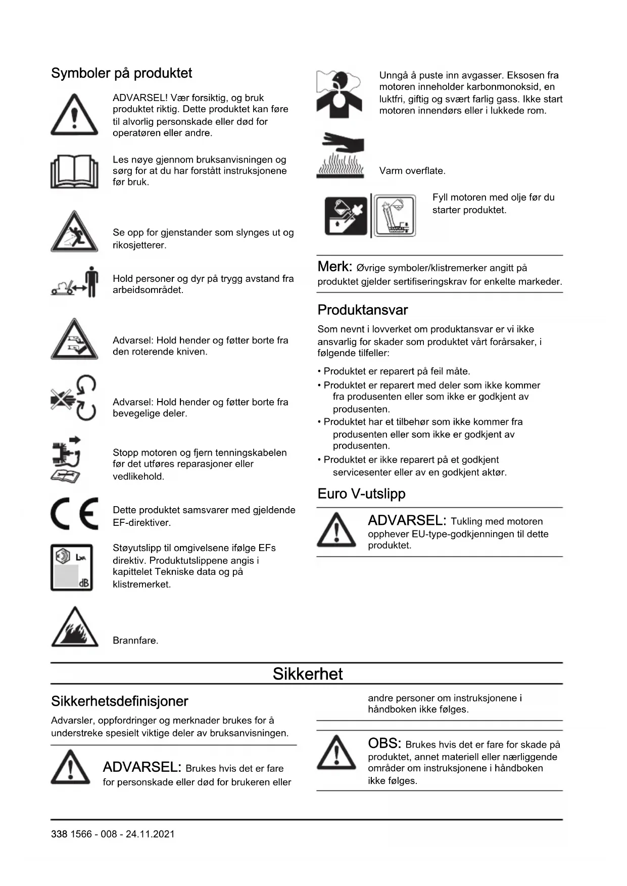 1566 - 008 - 24.11.2021 337Symboler på produktet ADVARSEL! Vær forsiktig, og bruk produktet riktig. Dette produktet kan føre til alvorlig personskade eller død for operatøren eller andre. Les nøye gjennom bruksanvisningen og sørg for at du har forstått instruksjonene før bruk. Se opp for gjenstander som slynges ut og rikosjetterer. Hold personer og dyr på trygg avstand fra arbeidsområdet. Advarsel: Hold hender og føtter borte fra den roterende kniven. Advarsel: Hold hender og føtter borte fra bevegelige deler. Stopp motoren og fjern tenningskabelen før det utføres reparasjoner eller vedlikehold. Dette produktet samsvarer med gjeldende EF-direktiver. Støyutslipp til omgivelsene ifølge EFs direktiv. Produktutslippene angis i kapittelet Tekniske data og på klistremerket. Brannfare. Unngå å puste inn avgasser. Eksosen fra motoren inneholder karbonmonoksid, en luktfri, giftig og svært farlig gass. Ikke start motoren innendørs eller i lukkede rom. Varm overflate. Fyll motoren med olje før du starter produktet. Merk: Øvrige symboler/klistremerker angitt på produktet gjelder sertifiseringskrav for enkelte markeder. Produktansvar Som nevnt i lovverket om produktansvar er vi ikke ansvarlig for skader som produktet vårt forårsaker, i følgende tilfeller: