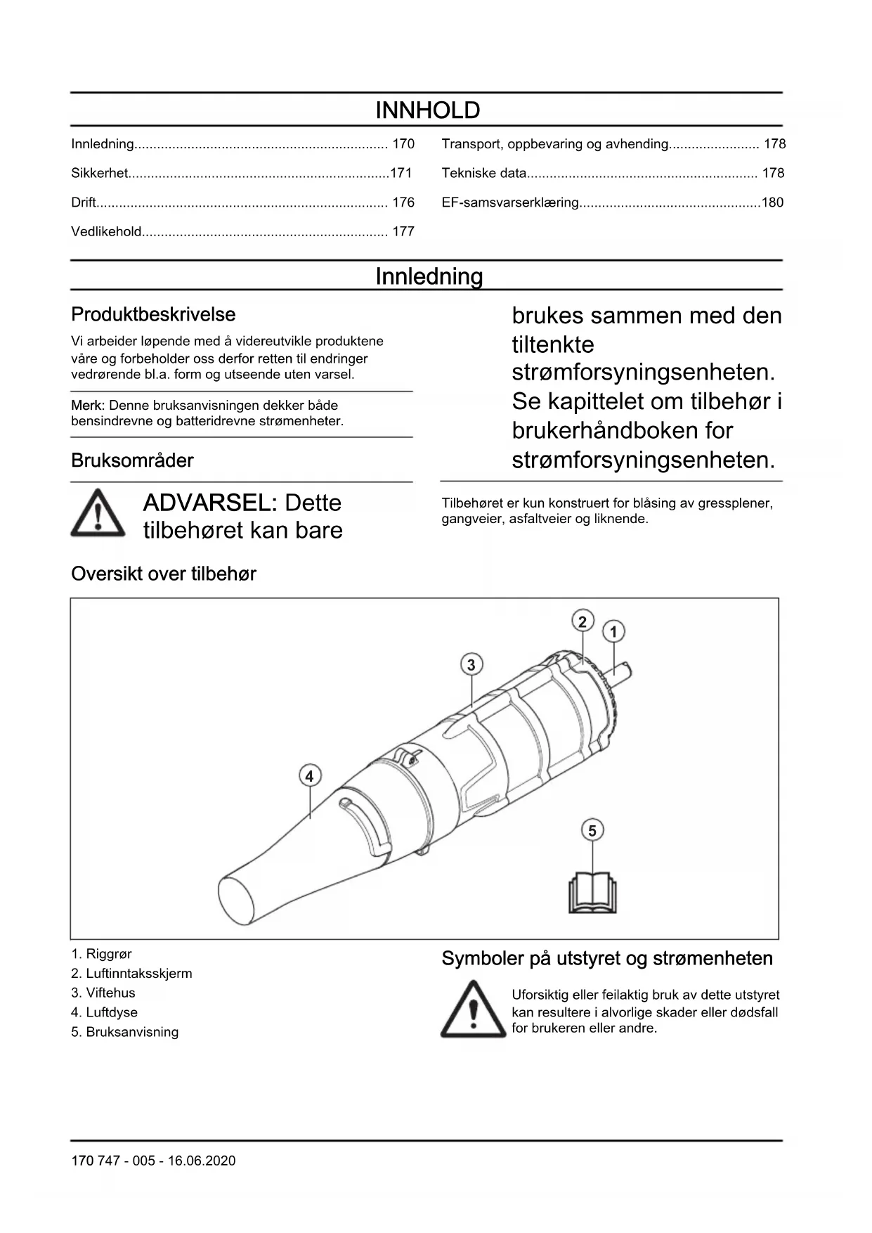 - EF-samsvarserklæring Innledning Produktbeskrivelse Vi arbeider løpende med å videreutvikle produktene våre og forbeholder oss derfor retten til endringer vedrørende bl.a. form og utseende uten varsel. Merk: Denne bruksanvisningen dekker både bensindrevne og batteridrevne strømenheter. Bruksområder ADVARSEL: Dette tilbehøret kan bare brukes sammen med den tiltenkte strømforsyningsenheten. Se kapittelet om tilbehør i brukerhåndboken for strømforsyningsenheten. Tilbehøret er kun konstruert for blåsing av gressplener, gangveier, asfaltveier og liknende. Oversikt over tilbehør p. 180