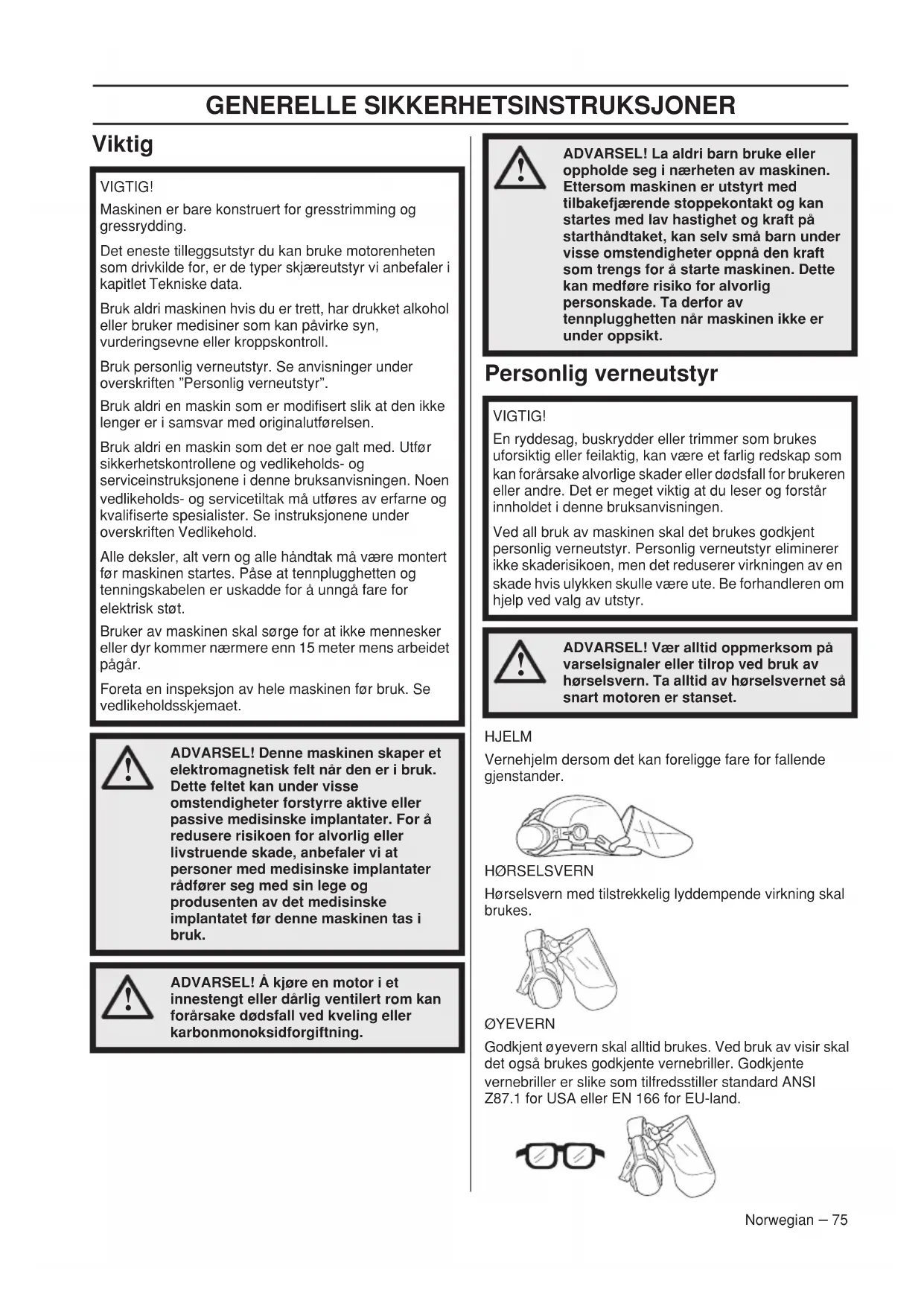 ADVARSEL! La aldri barn bruke eller oppholde seg i nærheten av maskinen. Ettersom maskinen er utstyrt med tilbakefjærende stoppekontakt og kan startes med lav hastighet og kraft på starthåndtaket, kan selv små barn under visse omstendigheter oppnå den kraft som trengs for å starte maskinen. Dette kan medføre risiko for alvorlig personskade. Ta derfor av tennplugghetten når maskinen ikke er under oppsikt. VIGTIG! En ryddesag, buskrydder eller trimmer som brukes uforsiktig eller feilaktig, kan være et farlig redskap som kan forårsake alvorlige skader eller dødsfall for brukeren eller andre. Det er meget viktig at du leser og forstår innholdet i denne bruksanvisningen. Ved all bruk av maskinen skal det brukes godkjent personlig verneutstyr. Personlig verneutstyr eliminerer ikke skaderisikoen, men det reduserer virkningen av en skade hvis ulykken skulle være ute. Be forhandleren om hjelp ved valg av utstyr.