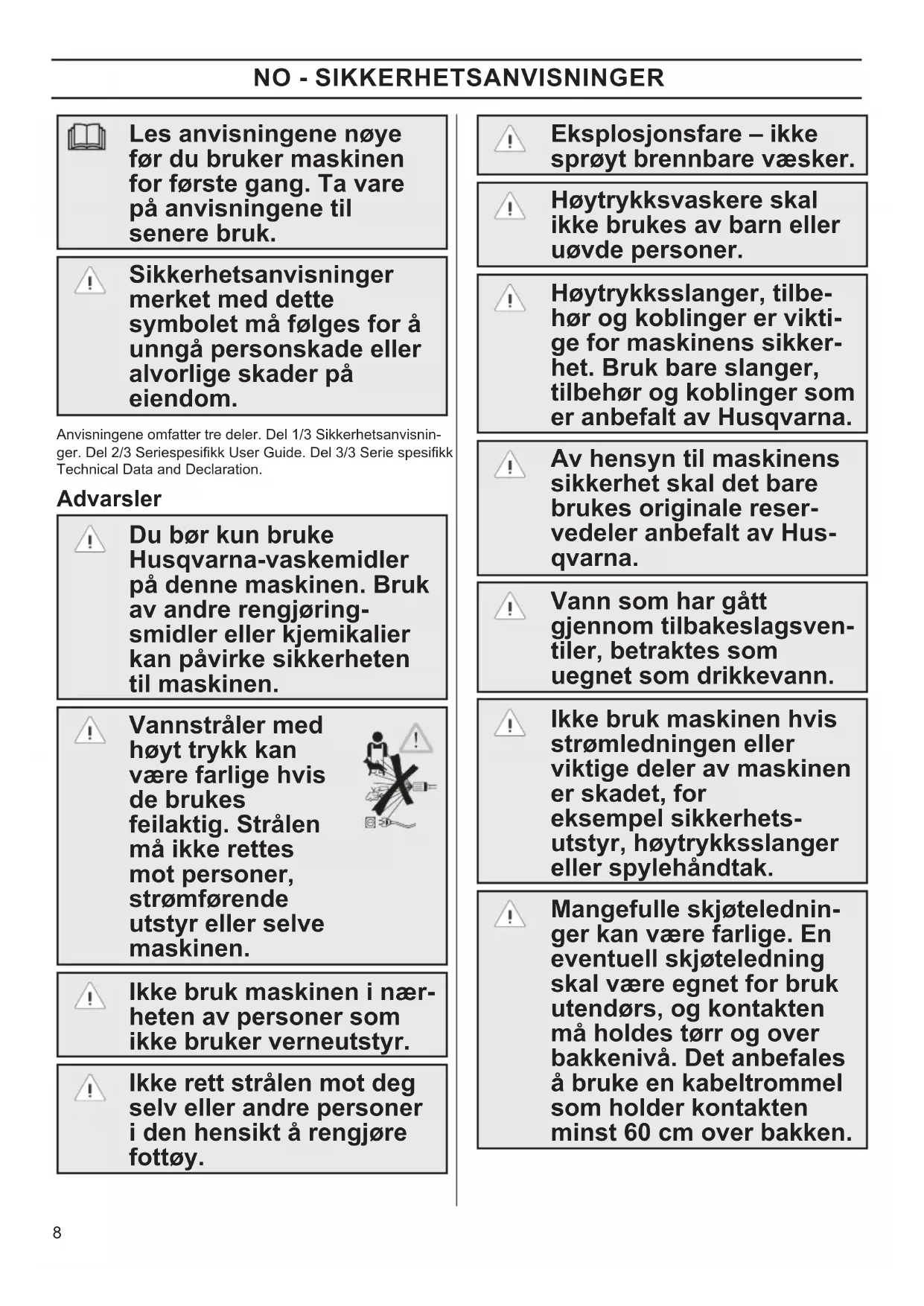 Les anvisningene nøye før du bruker maskinen for første gang. Ta vare på anvisningene til senere bruk. Sikkerhetsanvisninger merket med dette symbolet må følges for å unngå personskade eller alvorlige skader på eiendom. Anvisningene omfatter tre deler. Del 1/3 Sikkerhetsanvisnin- ger. Del 2/3 Seriespesikk User Guide. Del 3/3 Serie spesikk Technical Data and Declaration. Advarsler Du bør kun bruke Husqvarna-vaskemidler på denne maskinen. Bruk av andre rengjøring- smidler eller kjemikalier kan påvirke sikkerheten til maskinen. Vannstråler med høyt trykk kan være farlige hvis de brukes feilaktig. Strålen må ikke rettes mot personer, strømførende utstyr eller selve maskinen. Ikke bruk maskinen i nær- heten av personer som ikke bruker verneutstyr. Ikke rett strålen mot deg selv eller andre personer i den hensikt å rengjøre fottøy. Eksplosjonsfare – ikke sprøyt brennbare væsker. Høytrykksvaskere skal ikke brukes av barn eller uøvde personer. Høytrykksslanger, tilbe- hør og koblinger er vikti- ge for maskinens sikker- het. Bruk bare slanger, tilbehør og koblinger som er anbefalt av Husqvarna. Av hensyn til maskinens sikkerhet skal det bare brukes originale reser- vedeler anbefalt av Hus- qvarna. Vann som har gått gjennom tilbakeslagsven- tiler, betraktes som uegnet som drikkevann. Ikke bruk maskinen hvis strømledningen eller viktige deler av maskinen er skadet, for eksempel sikkerhets- utstyr, høytrykksslanger eller spylehåndtak. Mangefulle skjøtelednin- ger kan være farlige. En eventuell skjøteledning skal være egnet for bruk utendørs, og kontakten må holdes tørr og over bakkenivå. Det anbefales å bruke en kabeltrommel som holder kontakten minst 60 cm over bakken.9