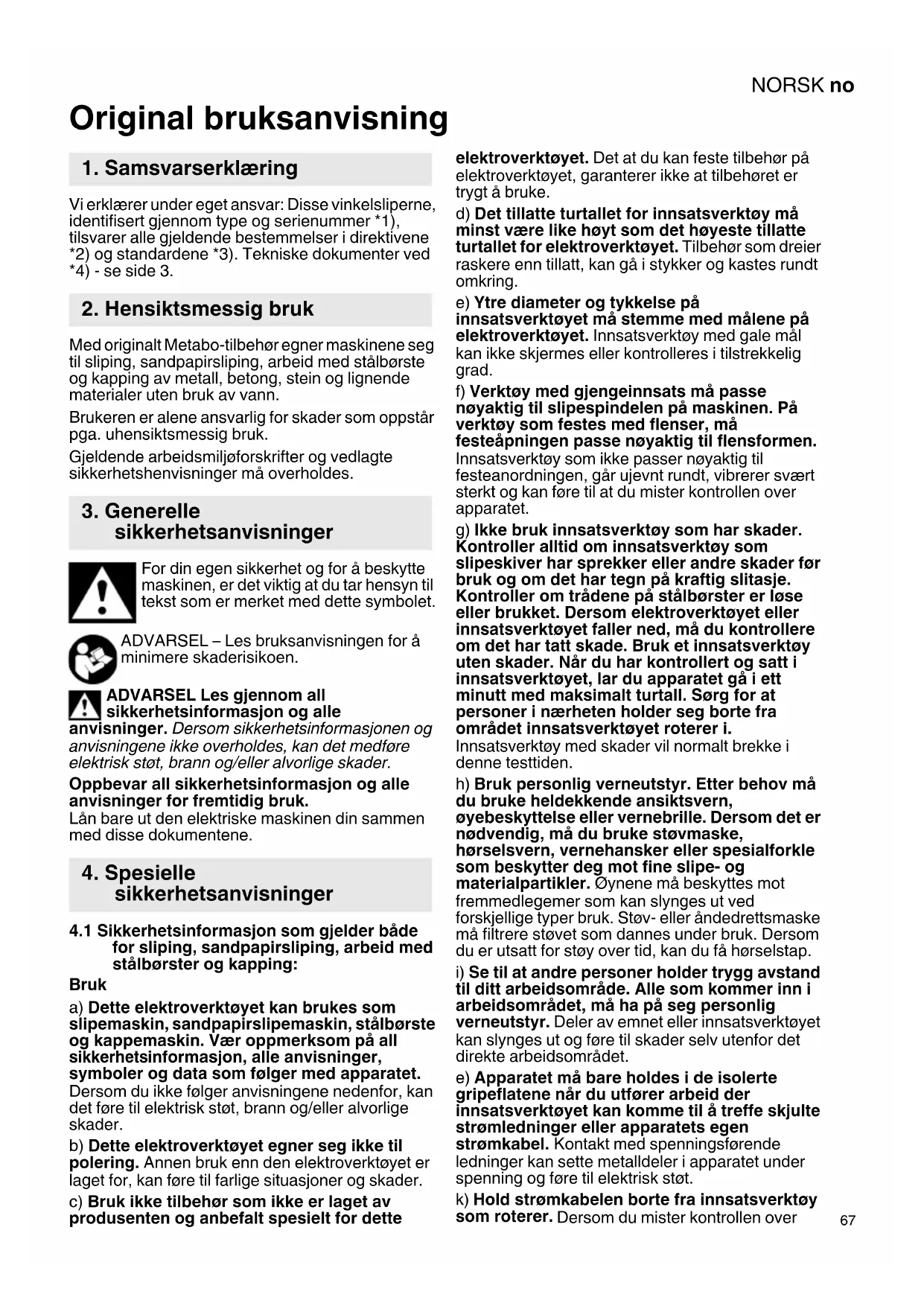 Original bruksanvisning Vi erklærer under eget ansvar: Disse vinkelsliperne, identifisert gjennom type og serienummer *1), tilsvarer alle gjeldende bestemmelser i direktivene *2) og standardene *3). Tekniske dokumenter ved *4) - se side 3. Med originalt Metabo-tilbehør egner maskinene seg til sliping, sandpapirsliping, arbeid med stålbørste og kapping av metall, betong, stein og lignende materialer uten bruk av vann. Brukeren er alene ansvarlig for skader som oppstår pga. uhensiktsmessig bruk. Gjeldende arbeidsmiljøforskrifter og vedlagte sikkerhetshenvisninger må overholdes. For din egen sikkerhet og for å beskytte maskinen, er det viktig at du tar hensyn til tekst som er merket med dette symbolet. ADVARSEL – Les bruksanvisningen for å minimere skaderisikoen. ADVARSEL Les gjennom all sikkerhetsinformasjon og alle anvisninger. Dersom sikkerhetsinformasjonen og anvisningene ikke overholdes, kan det medføre elektrisk støt, brann og/eller alvorlige skader. Oppbevar all sikkerhetsinformasjon og alle anvisninger for fremtidig bruk. Lån bare ut den elektriske maskinen din sammen med disse dokumentene.