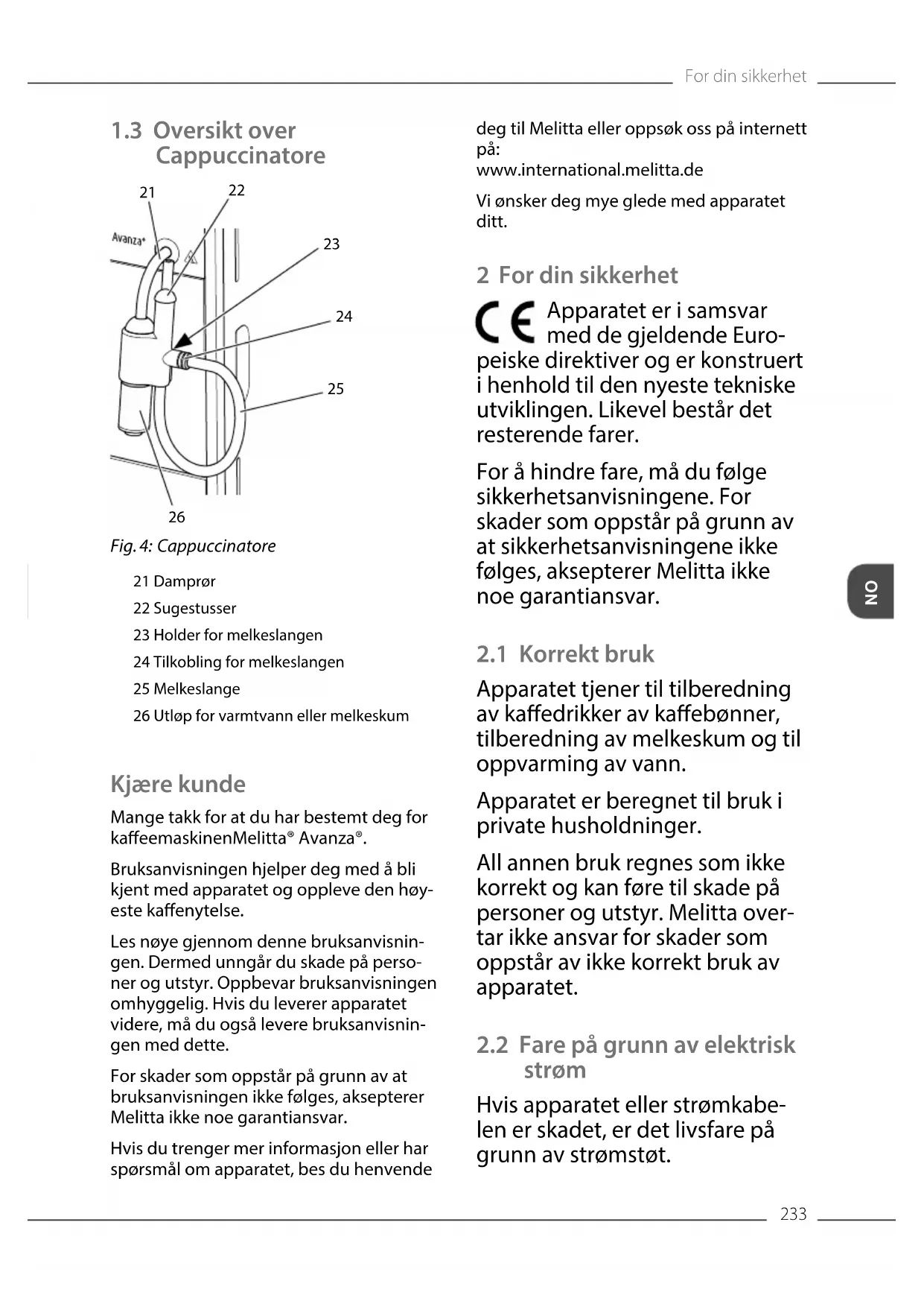 Fig. 4: Cappuccinatore 21 Damprør 22 Sugestusser 23 Holder for melkeslangen 24 Tilkobling for melkeslangen 25 Melkeslange 26 Utløp for varmtvann eller melkeskum Kjære kunde Mange takk for at du har bestemt deg for kaeemaskinen Melitta® Avanza®. Bruksanvisningen hjelper deg med å bli kjent med apparatet og oppleve den høy- este kaenytelse. Les nøye gjennom denne bruksanvisnin- gen. Dermed unngår du skade på perso- ner og utstyr. Oppbevar bruksanvisningen omhyggelig. Hvis du leverer apparatet videre, må du også levere bruksanvisnin- gen med dette. For skader som oppstår på grunn av at bruksanvisningen ikke følges, aksepterer Melitta ikke noe garantiansvar. Hvis du trenger mer informasjon eller har spørsmål om apparatet, bes du henvende deg til Melitta eller oppsøk oss på internett på: www.international.melitta.de Vi ønsker deg mye glede med apparatet ditt. 2 For din sikkerhet Apparatet er i samsvar med de gjeldende Euro- peiske direktiver og er konstruert i henhold til den nyeste tekniske utviklingen. Likevel består det resterende farer. For å hindre fare, må du følge sikkerhetsanvisningene. For skader som oppstår på grunn av at sikkerhetsanvisningene ikke følges, aksepterer Melitta ikke noe garantiansvar.