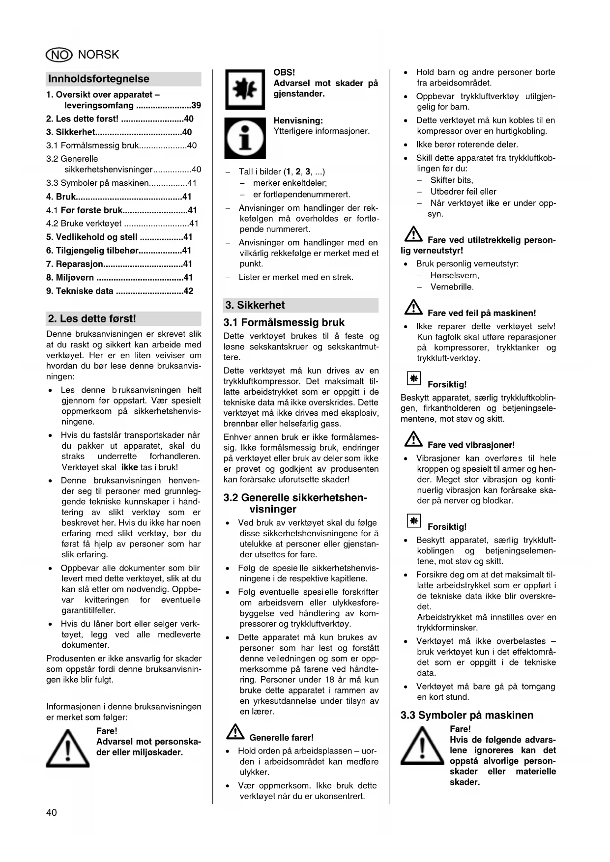 Dette verktoyet ma kun drives av entrykluftkompressor.Det maksimalt tilatte arbeidstrykket som er oppgitt i deTekniske data ma不信 overskrides.Dette verktoyet ma不信 drives med eksplosiv, brennbar eller helsefarlig gass.