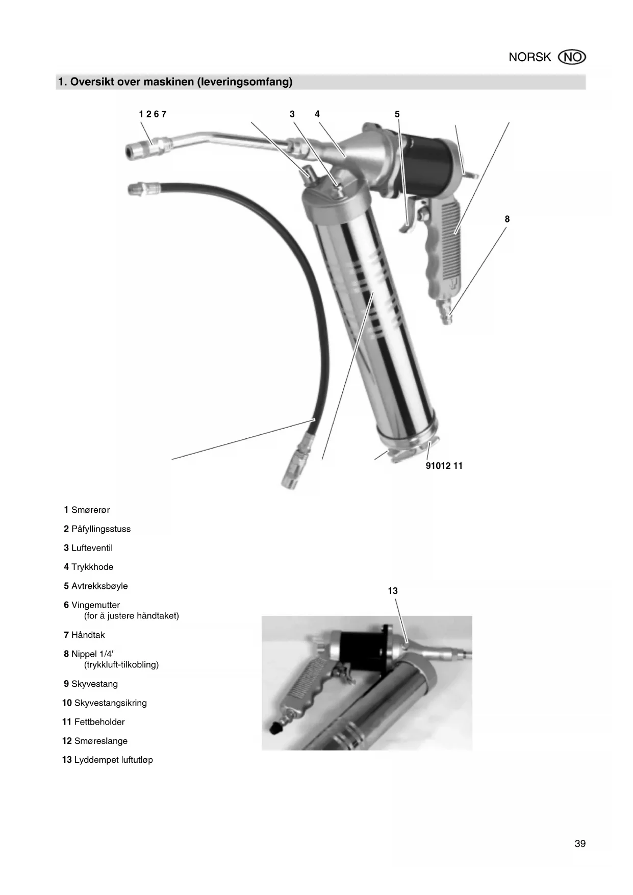 1 Smørerør 2 Påfyllingsstuss 3 Lufteventil 4 Trykkhode 5 Avtrekksbøyle 6 Vingemutter (for å justere håndtaket) 7 Håndtak 8 Nippel 1/4" (trykkluft-tilkobling) 9 Skyvestang 10 Skyvestangsikring 11 Fettbeholder 12 Smøreslange 13 Lyddempet luftutløp