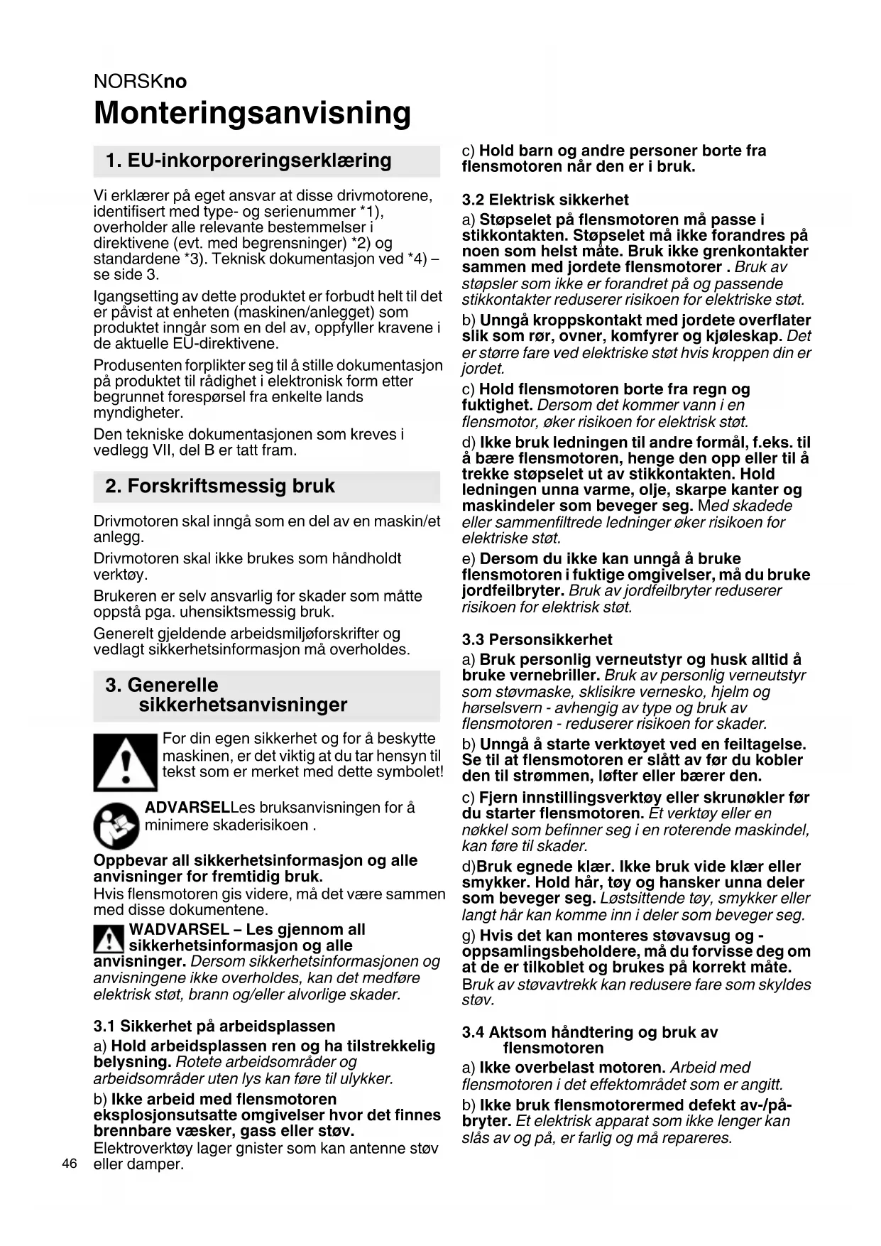 Monteringsanvisning Vi erklærer på eget ansvar at disse drivmotorene, identifisert med type- og serienummer *1), overholder alle relevante bestemmelser i direktivene (evt. med begrensninger) *2) og standardene *3). Teknisk dokumentasjon ved *4) – se side 3. Igangsetting av dette produktet er forbudt helt til det er påvist at enheten (maskinen/anlegget) som produktet inngår som en del av, oppfyller kravene i de aktuelle EU-direktivene. Produsenten forplikter seg til å stille dokumentasjon på produktet til rådighet i elektronisk form etter begrunnet forespørsel fra enkelte lands myndigheter. Den tekniske dokumentasjonen som kreves i vedlegg VII, del B er tatt fram. Drivmotoren skal inngå som en del av en maskin/et anlegg. Drivmotoren skal ikke brukes som håndholdt verktøy. Brukeren er selv ansvarlig for skader som måtte oppstå pga. uhensiktsmessig bruk. Generelt gjeldende arbeidsmiljøforskrifter og vedlagt sikkerhetsinformasjon må overholdes. For din egen sikkerhet og for å beskytte maskinen, er det viktig at du tar hensyn til tekst som er merket med dette symbolet! ADVARSELLes bruksanvisningen for å minimere skaderisikoen . Oppbevar all sikkerhetsinformasjon og alle anvisninger for fremtidig bruk. Hvis flensmotoren gis videre, må det være sammen med disse dokumentene. WADVARSEL – Les gjennom all sikkerhetsinformasjon og alle anvisninger. Dersom sikkerhetsinformasjonen og anvisningene ikke overholdes, kan det medføre elektrisk støt, brann og/eller alvorlige skader.