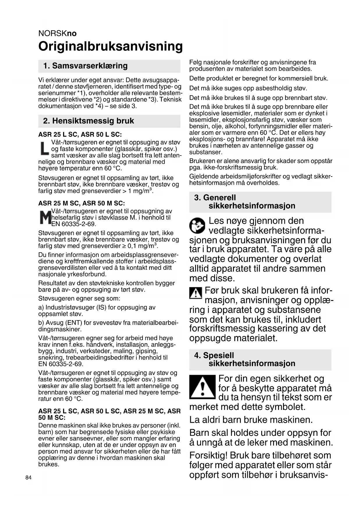 Originalbruksanvisning Vi erklærer under eget ansvar: Dette avsugsappa- ratet / denne støvfjerneren, identifisert med type- og serienummer *1), overholder alle relevante bestem- melser i direktivene *2) og standardene *3). Teknisk dokumentasjon ved *4) – se side 3. ASR 25 L SC, ASR 50 L SC: Våt-/tørrsugeren er egnet til oppsuging av støv og faste komponenter (glasskår, spiker osv.) samt væsker av alle slag bortsett fra lett anten- nelige og brennbare væsker og material med høyere temperatur enn 60 °C. Støvsugeren er egnet til oppsamling av tørt, ikke brennbart støv, ikke brennbare væsker, trestøv og farlig støv med grenseverdier > 1 mg/m³. ASR 25 M SC, ASR 50 M SC: Våt-/tørrsugeren er egnet til oppsugning av helsefarlig støv i støvklasse M. i henhold til EN 60335-2-69. Støvsugeren er egnet til oppsamling av tørt, ikke brennbart støv, ikke brennbare væsker, trestøv og farlig støv med grenseverdier ≥ 0,1 mg/m³. Du finner informasjon om arbeidsplassgrensever- diene og kreftfremkallende stoffer i arbeidsplass- grenseverdilisten eller ved å ta kontakt med ditt nasjonale yrkesforbund. Resultatet av den støvtekniske kontrollen bygger bare på av- og oppsuging av tørt støv. Støvsugeren egner seg som: a) Industristøvsuger (IS) for oppsuging av oppsamlet støv. b) Avsug (ENT) for svevestøv fra materialbearbei- dingsmaskiner. Våt-/tørrsugeren egner seg for arbeid med høye krav innen f.eks. håndverk, installasjon, anleggs- bygg, industri, verksteder, maling, gipsing, snekring, trebearbeidingsbedrifter i henhold til EN 60335-2-69. Våt-/tørrsugeren er egnet til oppsuging av støv og faste komponenter (glasskår, spiker osv.) samt væsker av alle slag bortsett fra lett antennelige og brennbare væsker og material med høyere tempe- ratur enn 60 °C. ASR 25 L SC, ASR 50 L SC, ASR 25 M SC, ASR 50 M SC: Denne maskinen skal ikke brukes av personer (inkl. barn) som har begrensede fysiske eller psykiske evner eller sanseevner, eller som mangler erfaring eller kunnskap, uten at de er under oppsyn av en person med ansvar for sikkerheten eller de har fått opplæring av denne i hvordan maskinen skal brukes. Følg nasjonale forskrifter og anvisningene fra produsenten av materialet som bearbeides. Dette produktet er beregnet for kommersiell bruk. Det må ikke suges opp asbestholdig støv. Det må ikke brukes til å suge opp brennbart støv. Det må ikke brukes til å suge opp brennbare eller eksplosive løsemidler, materialer som er dynket i løsemidler, eksplosjonsfarlig støv, væsker som bensin, olje, alkohol, fortynningsmidler eller materi- aler som er varmere enn 60 °C. Det er ellers høy eksplosjons- og brannfare! Apparatet må ikke brukes i nærheten av antennelige gasser og substanser. Brukeren er alene ansvarlig for skader som oppstår pga. ikke-forskriftsmessig bruk. Gjeldende arbeidsmiljøforskrifter og vedlagt sikker- hetsinformasjon må overholdes. Les nøye gjennom den vedlagte sikkerhetsinforma- sjonen og bruksanvisningen før du tar i bruk apparatet. Ta vare på alle vedlagte dokumenter og overlat alltid apparatet til andre sammen med disse. Før bruk skal brukeren få infor- masjon, anvisninger og opplæ- ring i apparatet og substansene som det kan brukes til, inkludert forskriftsmessig kassering av det oppsugde materialet. For din egen sikkerhet og for å beskytte apparatet må du ta hensyn til tekst som er merket med dette symbolet. La aldri barn bruke maskinen. Barn skal holdes under oppsyn for å unngå at de leker med maskinen. Forsiktig! Bruk bare tilbehøret som følger med apparatet eller som står oppført som tilbehør i bruksanvis-