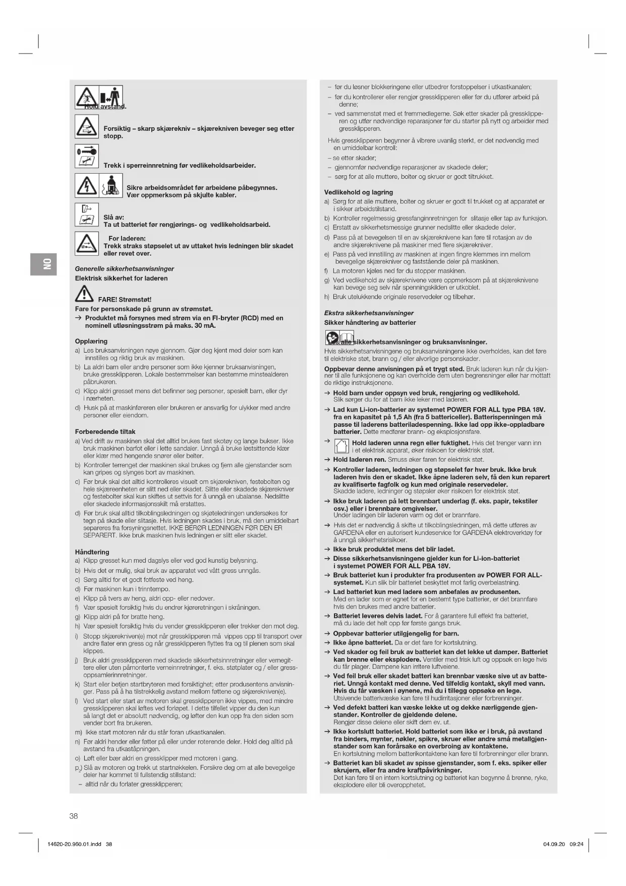 ) Slå av motoren og trekk ut startnøkkelen. Forsikre deg om at alle bevegelige deler har kommet til fullstendig stillstand: – alltid når du forlater gressklipperen; – før du løsner blokkeringene eller utbedrer forstoppelser i utkastkanalen; – før du kontrollerer eller rengjør gressklipperen eller før du utfører arbeid på denne; – ved sammenstøt med et fremmedlegeme. Søk etter skader på gressklippe- ren og utfør nødvendige reparasjoner før du starter på nytt og arbeider med gressklipperen. Hvis gressklipperen begynner å vibrere uvanlig sterkt, er det nødvendig med en umiddelbar kontroll: – se etter skader; – gjennomfør nødvendige reparasjoner av skadede deler; – sørg for at alle muttere, bolter og skruer er godt tiltrukket. Vedlikehold og lagring a) Sørg for at alle muttere, bolter og skruer er godt til trukket og at apparatet er isikker arbeidstilstand. b) Kontroller regelmessig gressfanginnretningen for slitasje eller tap av funksjon. c) Erstatt av sikkerhetsmessige grunner nedslitte eller skadede deler. d) Pass på at bevegelsen til en av skjæreknivene kan føre til rotasjon av de andre skjæreknivene på maskiner med flere skjærekniver. e) Pass på ved innstilling av maskinen at ingen fingre klemmes inn mellom bevegelige skjærekniver og faststående deler på maskinen. f) La motoren kjøles ned før du stopper maskinen. g) Ved vedlikehold av skjæreknivene være oppmerksom på at skjæreknivene kan bevege seg selv når spenningskilden er utkoblet. h) Bruk utelukkende originale reservedeler og tilbehør. Ekstra sikkerhetsanvisninger Sikker håndtering av batterier Les alle sikkerhetsanvisninger og bruksanvisninger. Hvis sikkerhetsanvisningene og bruksanvisningene ikke overholdes, kan det føre til elektriske støt, brann og / eller alvorlige personskader. Oppbevar denne anvisningen på et trygt sted. Bruk laderen kun når du kjen- ner til alle funksjonene og kan overholde dem uten begrensninger eller har mottatt de riktige instruksjonene. v Hold barn under oppsyn ved bruk, rengjøring og vedlikehold. Slik sørger du for at barn ikke leker med laderen. v Lad kun Li-ion-batterier av systemet POWER FOR ALL type PBA 18V. fra en kapasitet på 1,5 Ah (fra 5 battericeller). Batterispenningen må passe til laderens batteriladespenning. Ikke lad opp ikke-oppladbare batterier. Dette medfører brann- og eksplosjonsfare.