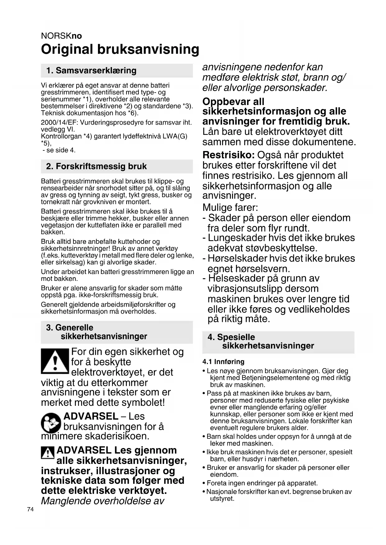 ADVARSEL – Generelle farer! Les bruksanvisningen. Se til at ingen kan bli skadet pga. fremmedlegemer som slynges ut. Hold andre personer vekk. Hold personer og husdyr som er i nærheten av apparatet på sikker avstand. Hold andre personer vekk. Overhold en avstand på minst 15 m til andre personer og gjenstander. Beskytt apparatet mot fuktighet. Beskyttes mot regn. Bruk vernebriller. Bruk hørselvern. Påvirkning av støy kan gi hørselskader. Bruk hjelm hvis det er fare for at deler faller ned. Bruk sklisikker fotbeskyttelse. Bruk ikke metall-sagblader. Bruk hansker.NORSK no