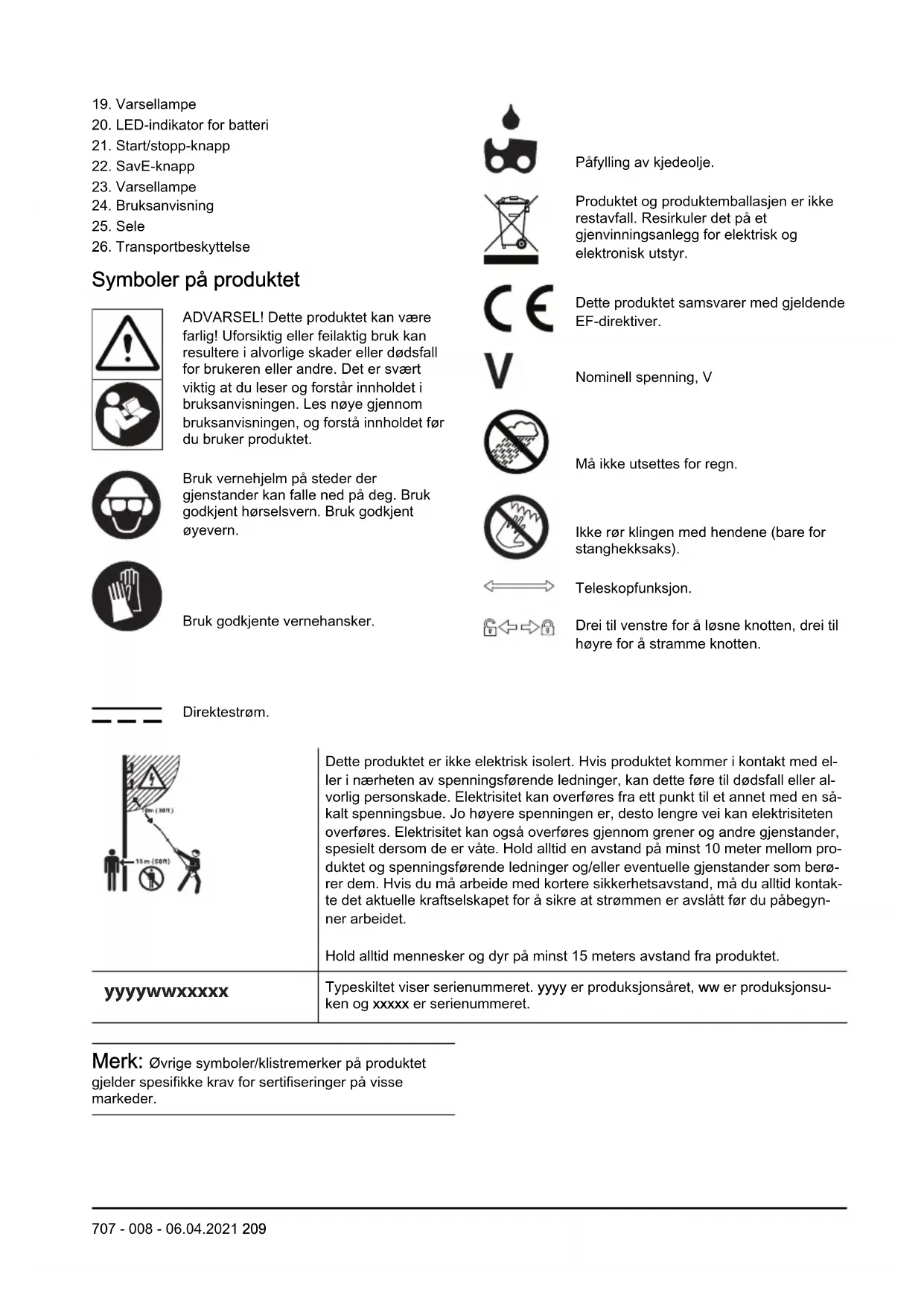 Symboler på produktet ADVARSEL! Dette produktet kan være farlig! Uforsiktig eller feilaktig bruk kan resultere i alvorlige skader eller dødsfall for brukeren eller andre. Det er svært viktig at du leser og forstår innholdet i bruksanvisningen. Les nøye gjennom bruksanvisningen, og forstå innholdet før du bruker produktet. Bruk vernehjelm på steder der gjenstander kan falle ned på deg. Bruk godkjent hørselsvern. Bruk godkjent øyevern. Bruk godkjente vernehansker. Direktestrøm. Påfylling av kjedeolje. Produktet og produktemballasjen er ikke restavfall. Resirkuler det på et gjenvinningsanlegg for elektrisk og elektronisk utstyr. Dette produktet samsvarer med gjeldende EF-direktiver. Nominell spenning, V Må ikke utsettes for regn. Ikke rør klingen med hendene (bare for stanghekksaks). Teleskopfunksjon. Drei til venstre for å løsne knotten, drei til høyre for å stramme knotten. Dette produktet er ikke elektrisk isolert. Hvis produktet kommer i kontakt med el- ler i nærheten av spenningsførende ledninger, kan dette føre til dødsfall eller al- vorlig personskade. Elektrisitet kan overføres fra ett punkt til et annet med en så- kalt spenningsbue. Jo høyere spenningen er, desto lengre vei kan elektrisiteten overføres. Elektrisitet kan også overføres gjennom grener og andre gjenstander, spesielt dersom de er våte. Hold alltid en avstand på minst 10 meter mellom pro- duktet og spenningsførende ledninger og/eller eventuelle gjenstander som berø- rer dem. Hvis du må arbeide med kortere sikkerhetsavstand, må du alltid kontak- te det aktuelle kraftselskapet for å sikre at strømmen er avslått før du påbegyn- ner arbeidet. Hold alltid mennesker og dyr på minst 15 meters avstand fra produktet. yyyywwxxxxx Typeskiltet viser serienummeret. yyyy er produksjonsåret, ww er produksjonsu- ken og xxxxx er serienummeret. Merk: Øvrige symboler/klistremerker på produktet gjelder spesifikke krav for sertifiseringer på visse markeder.