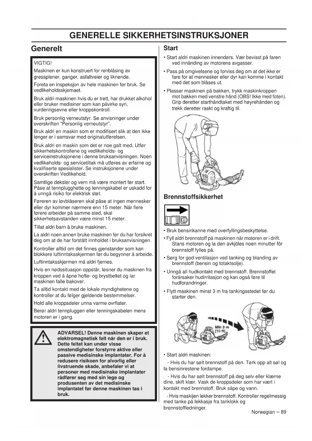 - Bruk bensinkanne med overfyllingsbeskyttelse.• Fyll aldri brennstoff på maskinen når motoren er i drift. Stans motoren og la den avkjöles noen minutter för brennstoff fylles på. • Sørg for god ventilasjon ved tanking og blanding av brennstoff (bensin og totaktsolje).• Unngå all hudkontakt med brennstoff. Brennstoffet forårsaker hudirritasjon og kan også føre til hudforandringer.• Flytt maskinen minst 3 m fra tankingsstedet før du starter den.• Start aldri maskinen: - Hvis du har sølt brennstoff på den. Tørk opp alt søl og la bensinrestene fordampe. - Hvis du har sølt brennstoff på deg selv eller klærne dine, skift klær. Vask de kroppsdeler som har vært i kontakt med brennstoff. Bruk såpe og vann. - Hvis maskijen lekker brennstoff. Kontroller regelmessig med tanke på lekkasje fra tanklokk og brennstoffledninger.VIGTIG!Maskinen er kun konstruert for renblåsing av gressplener, ganger, asfaltveier og liknende.Foreta en inspeksjon av hele maskinen før bruk. Se vedlikeholdsskjemaet.Bruk aldri maskinen hvis du er trett, har drukket alkohol eller bruker medisiner som kan påvirke syn, vurderingsevne eller kroppskontroll.Bruk personlig verneutstyr. Se anvisninger under overskriften ”Personlig verneutstyr”.Bruk aldri en maskin som er modifisert slik at den ikke lenger er i samsvar med originalutførelsen.Bruk aldri en maskin som det er noe galt med. Utfør sikkerhetskontrollene og vedlikeholds- og serviceinstruksjonene i denne bruksanvisningen. Noen vedlikeholds- og servicetiltak må utføres av erfarne og kvalifiserte spesialister. Se instruksjonene under overskriften Vedlikehold.Samtlige deksler og vern må være montert før start. Påse at tennplugghette og tenningskabel er uskadd for å unngå risiko for elektrisk støt.Føreren av løvblåseren skal påse at ingen mennesker eller dyr kommer nærmere enn 15 meter. Når flere førere arbeider på samme sted, skal sikkerhetsavstanden være minst 15 meter.Tillat aldri barn å bruke maskinen.La aldri noen annen bruke maskinen før du har forsikret deg om at de har forstått innholdet i bruksanvisningen.Kontroller alltid om det finnes gjenstander som kan blokkere luftinntaksskjermen før du begynner å arbeide.Luftinntaksskjermen må aldri fjernes.Hvis en nødssituasjon oppstår, løsner du maskinen fra kroppen ved å åpne hofte- og brystbeltet og lar maskinen falle bakover.Ta alltid kontakt med de lokale myndighetene og kontroller at du følger gjeldende bestemmelser.Hold alle kroppsdeler unna varme ovrflater.Berør aldri tennpluggen eller tenningskabelen mens motoren er i gang. ADVARSEL! Denne maskinen skaper et elektromagnetisk felt når den er i bruk. Dette feltet kan under visse omstendigheter forstyrre aktive eller passive medisinske implantater. For å redusere risikoen for alvorlig eller livstruende skade, anbefaler vi at personer med medisinske implantater rådfører seg med sin lege og produsenten av det medisinske implantatet før denne maskinen tas i bruk.GENERELLE SIKKERHETSINSTRUKSJONER 90 – Norwegian Transport og oppbevaring