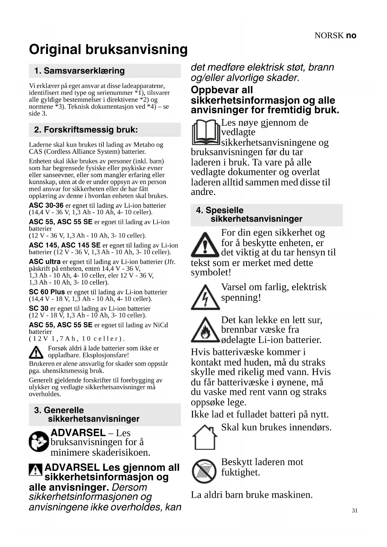 Original bruksanvisning Vi erklærer på eget ansvar at disse ladeapparatene, identifisert med type og serienummer *1), tilsvarer alle gyldige bestemmelser i direktivene *2) og normene *3). Teknisk dokumentasjon ved *4) – se side 3. Laderne skal kun brukes til lading av Metabo og CAS (Cordless Alliance System) batterier. Enheten skal ikke brukes av personer (inkl. barn) som har begrensede fysiske eller psykiske evner eller sanseevner, eller som mangler erfaring eller kunnskap, uten at de er under oppsyn av en person med ansvar for sikkerheten eller de har fått opplæring av denne i hvordan enheten skal brukes. ASC 30-36 er egnet til lading av Li-ion batterier (14,4 V - 36 V, 1,3 Ah - 10 Ah, 4- 10 celler). ASC 55, ASC 55 SE er egnet til lading av Li-ion batterier (12 V - 36 V, 1,3 Ah - 10 Ah, 3- 10 celler). ASC 145, ASC 145 SE er egnet til lading av Li-ion batterier (12 V - 36 V, 1,3 Ah - 10 Ah, 3- 10 celler). ASC ultra er egnet til lading av Li-ion batterier (Jfr. påskrift på enheten, enten 14,4 V - 36 V, 1,3 Ah - 10 Ah, 4- 10 celler, eler 12 V - 36 V, 1,3 Ah - 10 Ah, 3- 10 celler). SC 60 Plus er egnet til lading av Li-ion batterier (14,4 V - 18 V, 1,3 Ah - 10 Ah, 4- 10 celler). SC 30 er egnet til lading av Li-ion batterier (12 V - 18 V, 1,3 Ah - 10 Ah, 3- 10 celler). ASC 55, ASC 55 SE er egnet til lading av NiCd batterier (12V 1,7Ah, 10 celler). Forsøk aldri å lade batterier som ikke er oppladbare. Eksplosjonsfare! Brukeren er alene ansvarlig for skader som oppstår pga. uhensiktsmessig bruk. Generelt gjeldende forskrifter til forebygging av ulykker og vedlagte sikkerhetsanvisninger må overholdes. ADVARSEL – Les bruksanvisningen for å minimere skaderisikoen. ADVARSEL Les gjennom all sikkerhetsinformasjon og alle anvisninger. Dersom sikkerhetsinformasjonen og anvisningene ikke overholdes, kan det medføre elektrisk støt, brann og/eller alvorlige skader. Oppbevar all sikkerhetsinformasjon og alle anvisninger for fremtidig bruk. Les nøye gjennom de vedlagte sikkerhetsanvisningene og bruksanvisningen før du tar laderen i bruk. Ta vare på alle vedlagte dokumenter og overlat laderen alltid sammen med disse til andre. For din egen sikkerhet og for å beskytte enheten, er det viktig at du tar hensyn til tekst som er merket med dette symbolet! Varsel om farlig, elektrisk spenning! Det kan lekke en lett sur, brennbar væske fra ødelagte Li-ion batterier. Hvis batterivæske kommer i kontakt med huden, må du straks skylle med rikelig med vann. Hvis du får batterivæske i øynene, må du vaske med rent vann og straks oppsøke lege. Ikke lad et fulladet batteri på nytt. Skal kun brukes innendørs. Beskytt laderen mot fuktighet. La aldri barn bruke maskinen.
