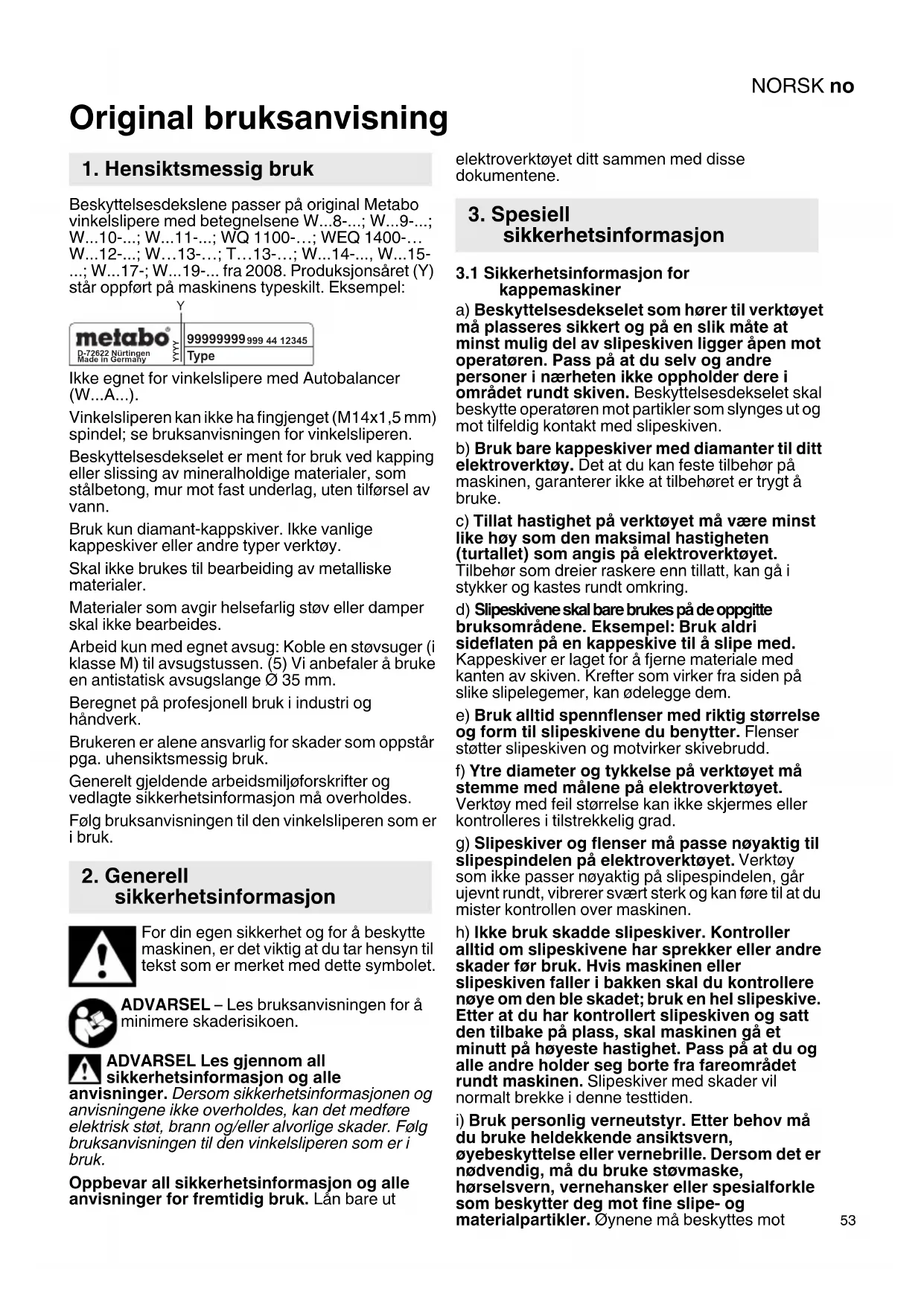 - -; W - fra 2008. Produksjonsåret (Y) står oppført på maskinens typeskilt. Eksempel: Ikke egnet for vinkelslipere med Autobalancer (W A ). Vinkelsliperen kan ikke ha fingjenget (M14x1,5 mm) spindel; se bruksanvisningen for vinkelsliperen. Beskyttelsesdekselet er ment for bruk ved kapping eller slissing av mineralholdige materialer, som stålbetong, mur mot fast underlag, uten tilførsel av vann. Bruk kun diamant-kappskiver. Ikke vanlige kappeskiver eller andre typer verktøy. Skal ikke brukes til bearbeiding av metalliske materialer. Materialer som avgir helsefarlig støv eller damper skal ikke bearbeides. Arbeid kun med egnet avsug: Koble en støvsuger (i klasse M) til avsugstussen. (5) Vi anbefaler å bruke en antistatisk avsugslange Ø 35 mm. Beregnet på profesjonell bruk i industri og håndverk. Brukeren er alene ansvarlig for skader som oppstår pga. uhensiktsmessig bruk. Generelt gjeldende arbeidsmiljøforskrifter og vedlagte sikkerhetsinformasjon må overholdes. Følg bruksanvisningen til den vinkelsliperen som er i bruk. For din egen sikkerhet og for å beskytte maskinen, er det viktig at du tar hensyn til tekst som er merket med dette symbolet. ADVARSEL – Les bruksanvisningen for å minimere skaderisikoen. ADVARSEL Les gjennom all sikkerhetsinformasjon og alle anvisninger. Dersom sikkerhetsinformasjonen og anvisningene ikke overholdes, kan det medføre elektrisk støt, brann og/eller alvorlige skader. Følg bruksanvisningen til den vinkelsliperen som er i bruk. Oppbevar all sikkerhetsinformasjon og alle anvisninger for fremtidig bruk. Lån bare ut elektroverktøyet ditt sammen med disse dokumentene. p. 19