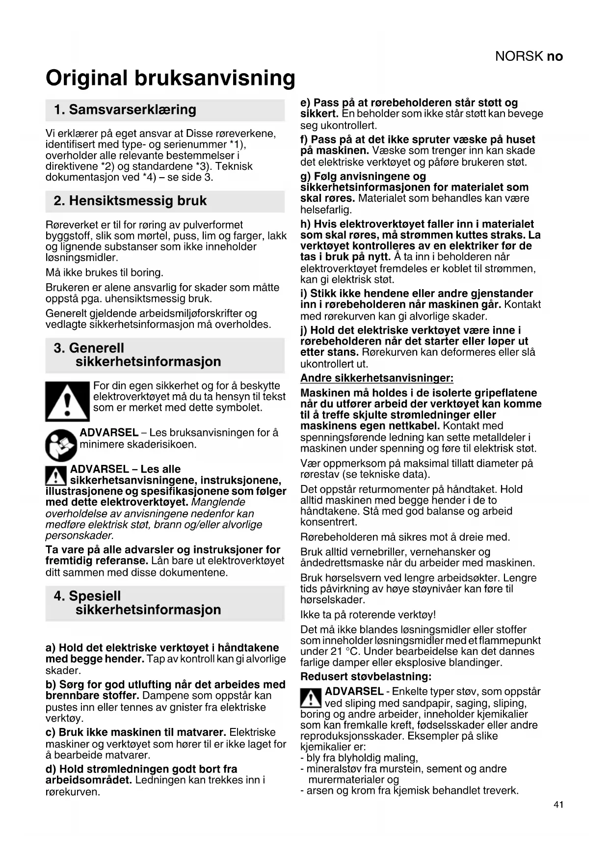 Original bruksanvisning Vi erklærer på eget ansvar at Disse røreverkene, identifisert med type- og serienummer *1), overholder alle relevante bestemmelser i direktivene *2) og standardene *3). Teknisk dokumentasjon ved *4) – se side 3. Røreverket er til for røring av pulverformet byggstoff, slik som mørtel, puss, lim og farger, lakk og lignende substanser som ikke inneholder løsningsmidler. Må ikke brukes til boring. Brukeren er alene ansvarlig for skader som måtte oppstå pga. uhensiktsmessig bruk. Generelt gjeldende arbeidsmiljøforskrifter og vedlagte sikkerhetsinformasjon må overholdes. For din egen sikkerhet og for å beskytte elektroverktøyet må du ta hensyn til tekst som er merket med dette symbolet. ADVARSEL – Les bruksanvisningen for å minimere skaderisikoen. ADVARSEL – Les alle sikkerhetsanvisningene, instruksjonene, illustrasjonene og spesifikasjonene som følger med dette elektroverktøyet. Manglende overholdelse av anvisningene nedenfor kan medføre elektrisk støt, brann og/eller alvorlige personskader. Ta vare på alle advarsler og instruksjoner for fremtidig referanse. Lån bare ut elektroverktøyet ditt sammen med disse dokumentene. a) Hold det elektriske verktøyet i håndtakene med begge hender. Tap av kontroll kan gi alvorlige skader. b) Sørg for god utlufting når det arbeides med brennbare stoffer. Dampene som oppstår kan pustes inn eller tennes av gnister fra elektriske verktøy. c) Bruk ikke maskinen til matvarer. Elektriske maskiner og verktøyet som hører til er ikke laget for å bearbeide matvarer. d) Hold strømledningen godt bort fra arbeidsområdet. Ledningen kan trekkes inn i rørekurven. e) Pass på at rørebeholderen står støtt og sikkert. En beholder som ikke står støtt kan bevege seg ukontrollert. f) Pass på at det ikke spruter væske på huset på maskinen. Væske som trenger inn kan skade det elektriske verktøyet og påføre brukeren støt. g) Følg anvisningene og sikkerhetsinformasjonen for materialet som skal røres. Materialet som behandles kan være helsefarlig. h) Hvis elektroverktøyet faller inn i materialet som skal røres, må strømmen kuttes straks. La verktøyet kontrolleres av en elektriker før de tas i bruk på nytt. Å ta inn i beholderen når elektroverktøyet fremdeles er koblet til strømmen, kan gi elektrisk støt.