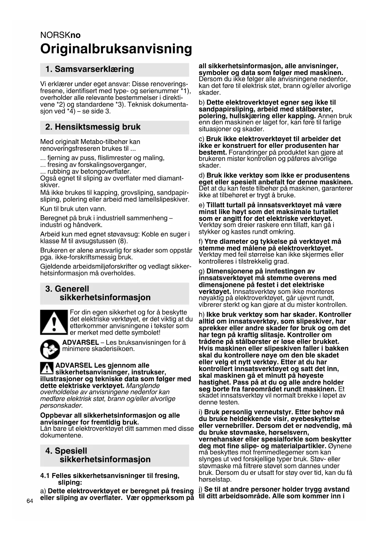 Originalbruksanvisning Vi erklærer under eget ansvar: Disse renoverings- fresene, identifisert med type- og serienummer *1), overholder alle relevante bestemmelser i direkti- vene *2) og standardene *3). Teknisk dokumenta- sjon ved *4) – se side 3. Med originalt Metabo-tilbehør kan renoveringsfreseren brukes til ... ... fjerning av puss, flislimrester og maling, ... fresing av forskalingsoverganger, ... rubbing av betongoverflater. Også egnet til sliping av overflater med diamant- skiver. Må ikke brukes til kapping, grovsliping, sandpapir- sliping, polering eller arbeid med lamellslipeskiver. Kun til bruk uten vann. Beregnet på bruk i industriell sammenheng – industri og håndverk. Arbeid kun med egnet støvavsug: Koble en suger i klasse M til avsugstussen (8). Brukeren er alene ansvarlig for skader som oppstår pga. ikke-forskriftsmessig bruk. Gjeldende arbeidsmiljøforskrifter og vedlagt sikker- hetsinformasjon må overholdes. For din egen sikkerhet og for å beskytte det elektriske verktøyet, er det viktig at du etterkommer anvisningene i tekster som er merket med dette symbolet! ADVARSEL – Les bruksanvisningen for å minimere skaderisikoen. ADVARSEL Les gjennom alle sikkerhetsanvisninger, instrukser, illustrasjoner og tekniske data som følger med dette elektriske verktøyet. Manglende overholdelse av anvisningene nedenfor kan medføre elektrisk støt, brann og/eller alvorlige personskader. Oppbevar all sikkerhetsinformasjon og alle anvisninger for fremtidig bruk. Lån bare ut elektroverktøyet ditt sammen med disse dokumentene.