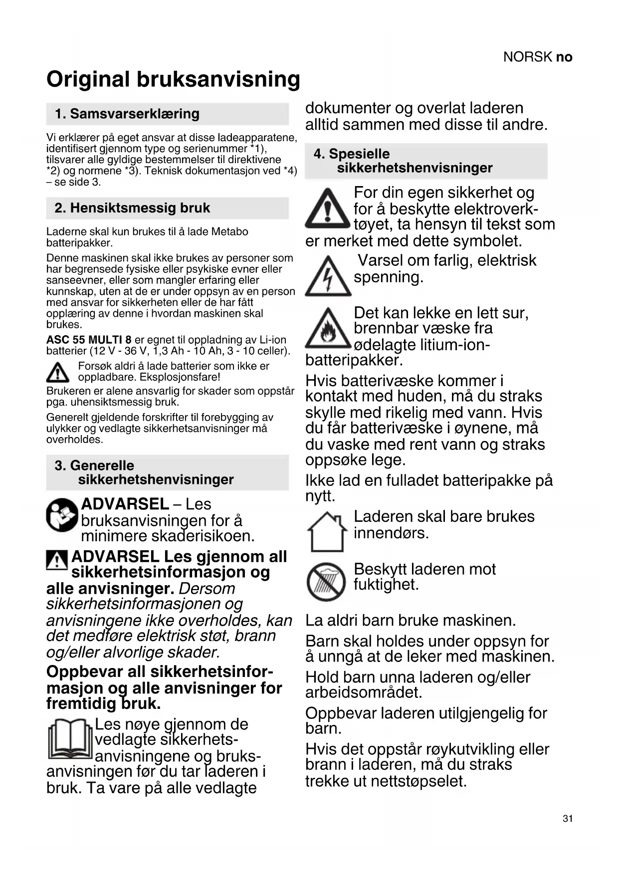 Original bruksanvisning Vi erklærer på eget ansvar at disse ladeapparatene, identifisert gjennom type og serienummer *1), tilsvarer alle gyldige bestemmelser til direktivene *2) og normene *3). Teknisk dokumentasjon ved *4) – se side 3. Laderne skal kun brukes til å lade Metabo batteripakker. Denne maskinen skal ikke brukes av personer som har begrensede fysiske eller psykiske evner eller sanseevner, eller som mangler erfaring eller kunnskap, uten at de er under oppsyn av en person med ansvar for sikkerheten eller de har fått opplæring av denne i hvordan maskinen skal brukes. ASC 55 MULTI 8 er egnet til oppladning av Li-ion batterier (12 V - 36 V, 1,3 Ah - 10 Ah, 3 - 10 celler). Forsøk aldri å lade batterier som ikke er oppladbare. Eksplosjonsfare! Brukeren er alene ansvarlig for skader som oppstår pga. uhensiktsmessig bruk. Generelt gjeldende forskrifter til forebygging av ulykker og vedlagte sikkerhetsanvisninger må overholdes. ADVARSEL – Les bruksanvisningen for å minimere skaderisikoen. ADVARSEL Les gjennom all sikkerhetsinformasjon og alle anvisninger. Dersom sikkerhetsinformasjonen og anvisningene ikke overholdes, kan det medføre elektrisk støt, brann og/eller alvorlige skader. Oppbevar all sikkerhetsinfor- masjon og alle anvisninger for fremtidig bruk. Les nøye gjennom de vedlagte sikkerhets- anvisningene og bruks- anvisningen før du tar laderen i bruk. Ta vare på alle vedlagte dokumenter og overlat laderen alltid sammen med disse til andre. For din egen sikkerhet og for å beskytte elektroverk- tøyet, ta hensyn til tekst som er merket med dette symbolet. Varsel om farlig, elektrisk spenning. Det kan lekke en lett sur, brennbar væske fra ødelagte litium-ion- batteripakker. Hvis batterivæske kommer i kontakt med huden, må du straks skylle med rikelig med vann. Hvis du får batterivæske i øynene, må du vaske med rent vann og straks oppsøke lege. Ikke lad en fulladet batteripakke på nytt. Laderen skal bare brukes innendørs. Beskytt laderen mot fuktighet. La aldri barn bruke maskinen. Barn skal holdes under oppsyn for å unngå at de leker med maskinen. Hold barn unna laderen og/eller arbeidsområdet. Oppbevar laderen utilgjengelig for barn. Hvis det oppstår røykutvikling eller brann i laderen, må du straks trekke ut nettstøpselet.