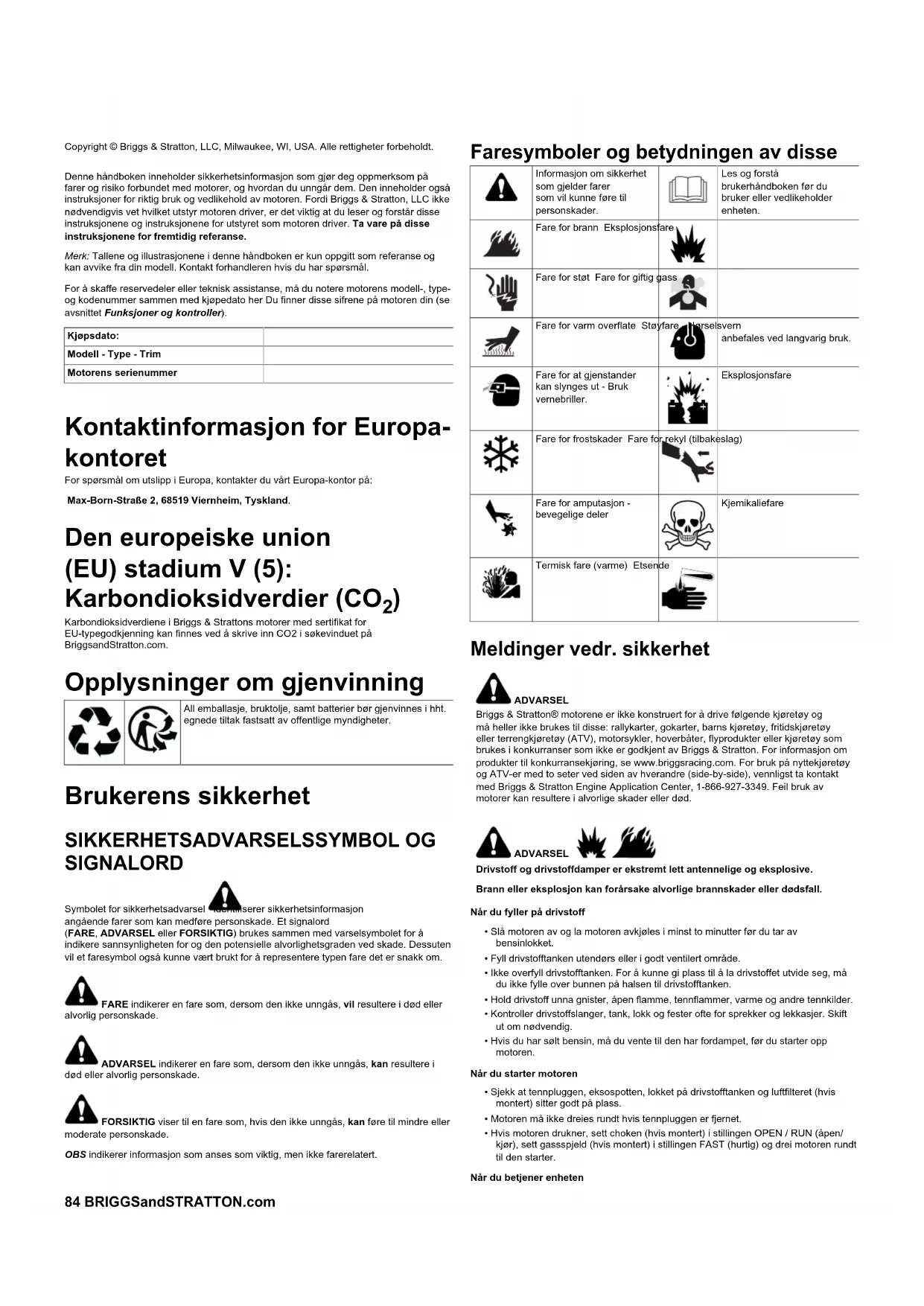 opslag van apparatuur, of onjuiste installatie van de motor. Garantieservice is alleen beschikbaar via Briggs & Stratton Geautoriseerde Service Dealers. U vindt uw dichtstbijzijnde Geautoriseerde Service Dealer in83 onze “dealer locator” kaart op www.BRIGGSsandSTRATTON.COM of door te bellen naar 1-800-233-3723 (in de VS). 80004537 (Rev. F)84 BRIGGSandSTRATTON.com Copyright © Briggs & Stratton, LLC, Milwaukee, WI, USA. Alle rettigheter forbeholdt. Denne håndboken inneholder sikkerhetsinformasjon som gjør deg oppmerksom på farer og risiko forbundet med motorer, og hvordan du unngår dem. Den inneholder også instruksjoner for riktig bruk og vedlikehold av motoren. Fordi Briggs & Stratton, LLC ikke nødvendigvis vet hvilket utstyr motoren driver, er det viktig at du leser og forstår disse instruksjonene og instruksjonene for utstyret som motoren driver. Ta vare på disse instruksjonene for fremtidig referanse. Merk:Tallene og illustrasjonene i denne håndboken er kun oppgitt som referanse og kan avvike fra din modell. Kontakt forhandleren hvis du har spørsmål. For å skaffe reservedeler eller teknisk assistanse, må du notere motorens modell-, type- og kodenummer sammen med kjøpedato her Du finner disse sifrene på motoren din (se avsnittet Funksjoner og kontroller). Kjøpsdato: Modell - Type - Trim Motorens serienummer Kontaktinformasjon for Europa- kontoret For spørsmål om utslipp i Europa, kontakter du vårt Europa-kontor på: Max-Born-Straße 2, 68519 Viernheim, Tyskland. Den europeiske union (EU) stadium V (5): Karbondioksidverdier (CO