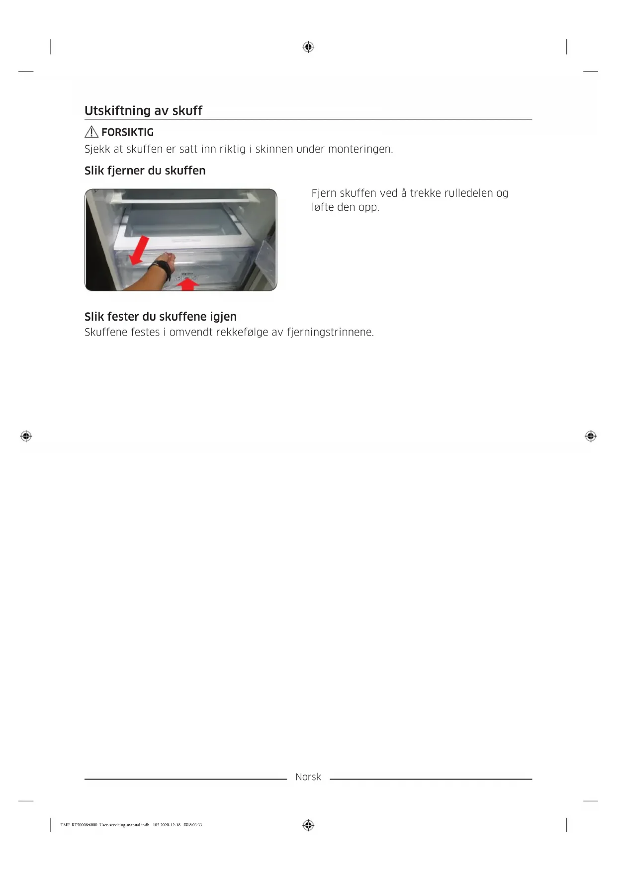 Slik bytter du pakningen Fest en ny pakning til kjøleskapsdøren. Kontroller at det ikke er noe mellomrom mellom den nye pakningen og døren. TMF_RT5000&6000_User-servicing-manual.indb 104 2020-12-18 8:03:32Norsk Utskiftning av skuff FORSIKTIG Sjekk at skuffen er satt inn riktig i skinnen under monteringen. Slik fjerner du skuffen Fjern skuffen ved å trekke rulledelen og løfte den opp. Slik fester du skuffene igjen Skuffene festes i omvendt rekkefølge av fjerningstrinnene. TMF_RT5000&6000_User-servicing-manual.indb 105 2020-12-18 8:03:33Norsk Utskiftning av hengsel For å skifte hengslene må du fjerne dørene først. FORSIKTIG