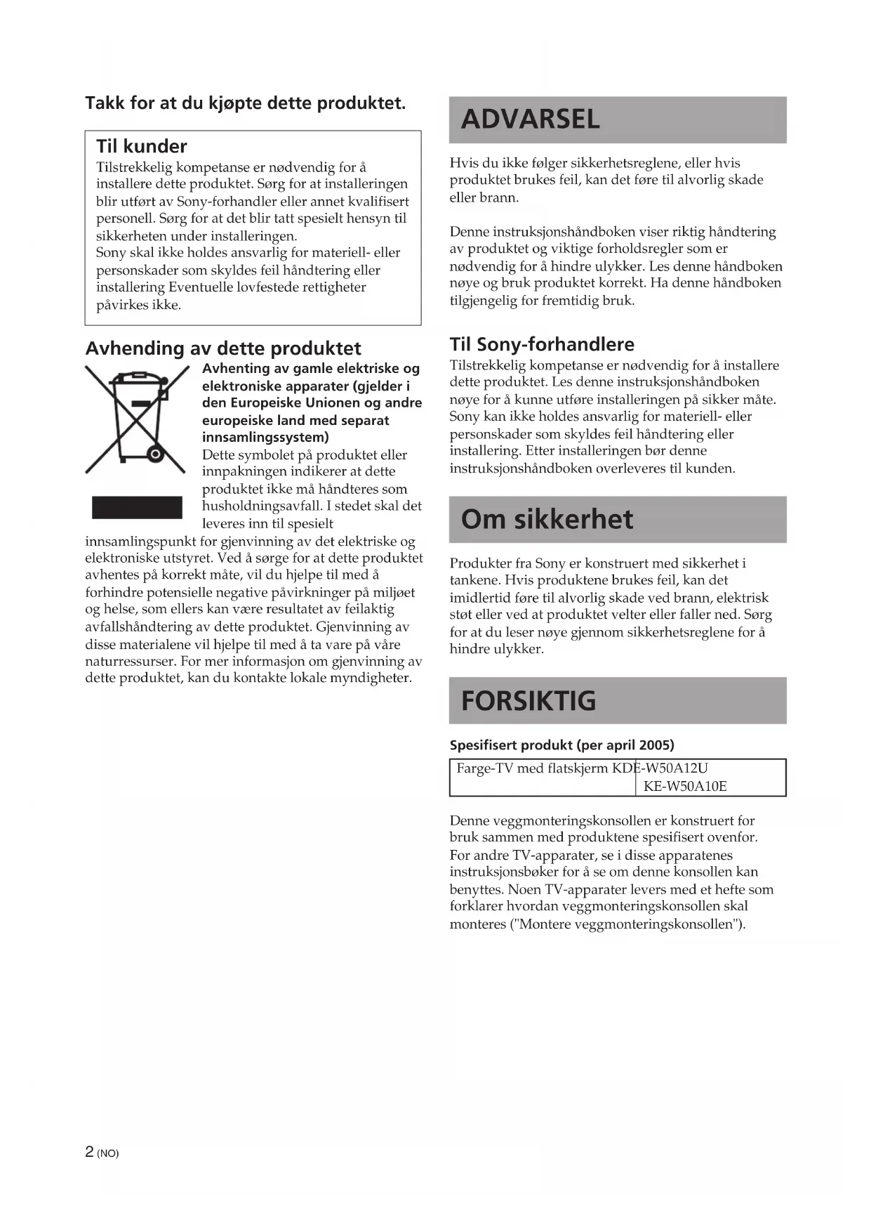 1312 (NO) ADVARSEL Hvis du ikke følger sikkerhetsreglene, eller hvis produktet brukes feil, kan det føre til alvorlig skade eller brann. Denne instruksjonshåndboken viser riktig håndtering av produktet og viktige forholdsregler som er nødvendig for å hindre ulykker. Les denne håndboken nøye og bruk produktet korrekt. Ha denne håndboken tilgjengelig for fremtidig bruk. Til Sony-forhandlere Tilstrekkelig kompetanse er nødvendig for å installere dette produktet. Les denne instruksjonshåndboken nøye for å kunne utføre installeringen på sikker måte. Sony kan ikke holdes ansvarlig for materiell- eller personskader som skyldes feil håndtering eller installering. Etter installeringen bør denne instruksjonshåndboken overleveres til kunden. Om sikkerhet Produkter fra Sony er konstruert med sikkerhet i tankene. Hvis produktene brukes feil, kan det imidlertid føre til alvorlig skade ved brann, elektrisk støt eller ved at produktet velter eller faller ned. Sørg for at du leser nøye gjennom sikkerhetsreglene for å hindre ulykker. FORSIKTIG Spesifisert produkt (per april 2005) Farge-TV med flatskjerm KDE-W50A12U KE-W50A10E Denne veggmonteringskonsollen er konstruert for bruk sammen med produktene spesifisert ovenfor. For andre TV-apparater, se i disse apparatenes instruksjonsbøker for å se om denne konsollen kan benyttes. Noen TV-apparater levers med et hefte som forklarer hvordan veggmonteringskonsollen skal monteres ("Montere veggmonteringskonsollen"). Takk for at du kjøpte dette produktet. Til kunder Tilstrekkelig kompetanse er nødvendig for å installere dette produktet. Sørg for at installeringen blir utført av Sony-forhandler eller annet kvalifisert personell. Sørg for at det blir tatt spesielt hensyn til sikkerheten under installeringen. Sony skal ikke holdes ansvarlig for materiell- eller personskader som skyldes feil håndtering eller installering Eventuelle lovfestede rettigheter påvirkes ikke. Avhending av dette produktet Avhenting av gamle elektriske og elektroniske apparater (gjelder i den Europeiske Unionen og andre europeiske land med separat innsamlingssystem) Dette symbolet på produktet eller innpakningen indikerer at dette produktet ikke må håndteres som husholdningsavfall. I stedet skal det leveres inn til spesielt innsamlingspunkt for gjenvinning av det elektriske og elektroniske utstyret. Ved å sørge for at dette produktet avhentes på korrekt måte, vil du hjelpe til med å forhindre potensielle negative påvirkninger på miljøet og helse, som ellers kan være resultatet av feilaktig avfallshåndtering av dette produktet. Gjenvinning av disse materialene vil hjelpe til med å ta vare på våre naturressurser. For mer informasjon om gjenvinning av dette produktet, kan du kontakte lokale myndigheter.3 (NO) Norsk
