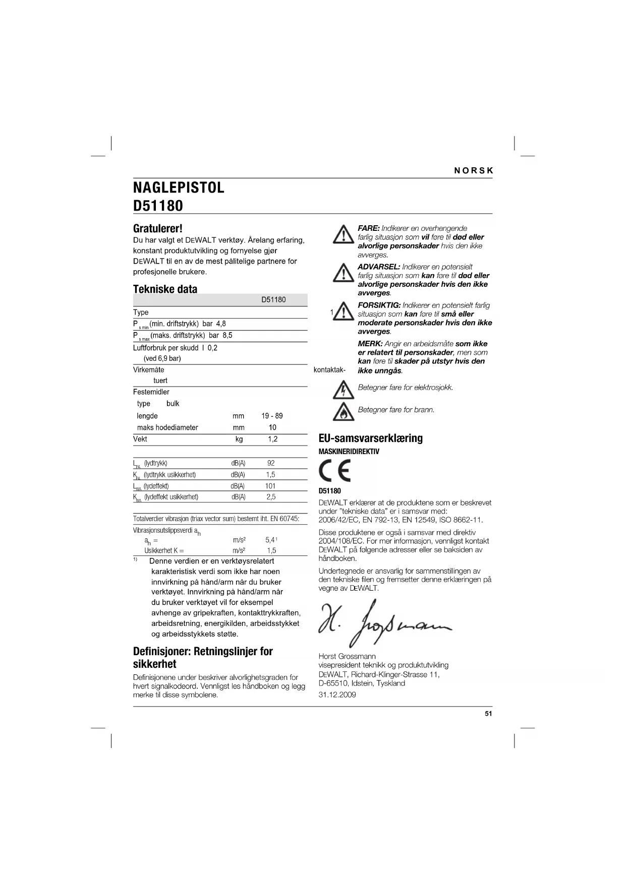 Denne verdien er en verktøysrelatert karakteristisk verdi som ikke har noen innvirkning på hånd/arm når du bruker verktøyet. Innvirkning på hånd/arm når du bruker verktøyet vil for eksempel avhenge av gripekraften, kontakttrykkraften, arbeidsretning, energikilden, arbeidsstykket og arbeidsstykkets støtte. Defi nisjoner: Retningslinjer for sikkerhet Definisjonene under beskriver alvorlighetsgraden for hvert signalkodeord. Vennligst les håndboken og legg merke til disse symbolene. FARE: Indikerer en overhengende farlig situasjon som vil føre til død eller alvorlige personskader hvis den ikke avverges. ADVARSEL: Indikerer en potensielt farlig situasjon som kan føre til død eller alvorlige personskader hvis den ikke avverges. FORSIKTIG: Indikerer en potensielt farlig situasjon som kan føre til små eller moderate personskader hvis den ikke avverges. MERK: Angir en arbeidsmåte som ikke er relatert til personskader, men som kan føre til skader på utstyr hvis den ikke unngås. Betegner fare for elektrosjokk. Betegner fare for brann. EU-samsvarserklæring MASKINERIDIREKTIV D51180 DEWALT erklærer at de produktene som er beskrevet under ”tekniske data” er i samsvar med: 2006/42/EC, EN 792-13, EN 12549, ISO 8662-11. Disse produktene er også i samsvar med direktiv 2004/108/EC. For mer informasjon, vennligst kontakt