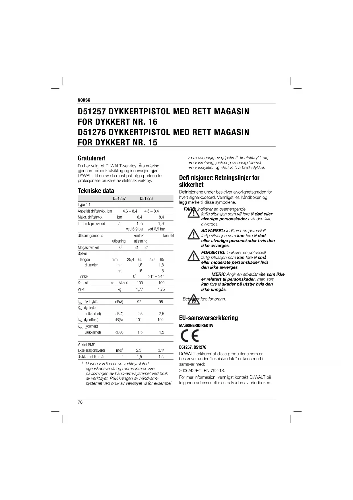 være avhengig av gripekraft, kontakttrykkraft, arbeidsretning, justering av energitilførsel, arbeidsstykket og støtten til arbeidsstykket. Defi nisjoner: Retningslinjer for sikkerhet Definisjonene under beskriver alvorlighetsgraden for hvert signalkodeord. Vennligst les håndboken og legg merke til disse symbolene. FARE: Indikerer en overhengende farlig situasjon som vil føre til død eller alvorlige personskader hvis den ikke avverges. ADVARSEL: Indikerer en potensielt farlig situasjon som kan føre til død eller alvorlige personskader hvis den ikke avverges. FORSIKTIG: Indikerer en potensielt farlig situasjon som kan føre til små eller moderate personskader hvis den ikke avverges. MERK: Angir en arbeidsmåte som ikke er relatert til personskader, men som kan føre til skader på utstyr hvis den ikke unngås. Betegner fare for brann. EU-samsvarserklæring MASKINERIDIREKTIV D51257, D51276 DEWALT erklærer at disse produktene som er beskrevet under “tekniske data” er konstruert i samsvar med: 2006/42/EC, EN 792-13. For mer informasjon, vennligst kontakt DEWALT på følgende adresser eller se baksiden av håndboken. Gratulerer! Du har valgt et DEWALT-verktøy. Års erfaring gjennom produktutvikling og innovasjon gjør DEWALT til en av de mest pålitelige partene for profesjonelle brukere av elektrisk verktøy. Tekniske data D51257 D51276 Type 1 1 Anbefalt driftstrykk bar 4,6 – 8,4 4,6 – 8,4 Maks. driftstrykk bar 8,4 8,4 Luftbruk pr. skudd l/m 1,27 1,70 ved 6,9 bar ved 6,9 bar Utløsningsmodus kontakt- kontakt- utløsning utløsning Magasinvinkel 0˚ 31° – 34° Spiker lengde mm 25,4 – 65 25,4 – 65 diameter mm 1,6 1,8 nr. 16 15 vinkel 0˚ 31° – 34° Kapasitet ant. dykkert 100 100 Vekt kg 1,77 1,75