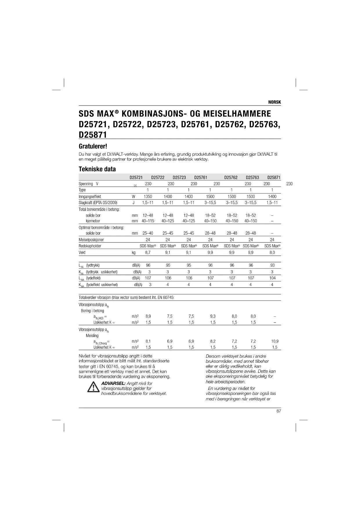 D25721, D25722, D25723, D25761, D25762, D25763, D25871 Gratulerer! Du har valgt et DEWALT-verktøy. Mange års erfaring, grundig produktutvikling og innovasjon gjør DEWALT til en meget pålitelig partner for profesjonelle brukere av elektrisk verktøy. Tekniske data D25721 D25722 D25723 D25761 D25762 D25763 D25871 Spenning V