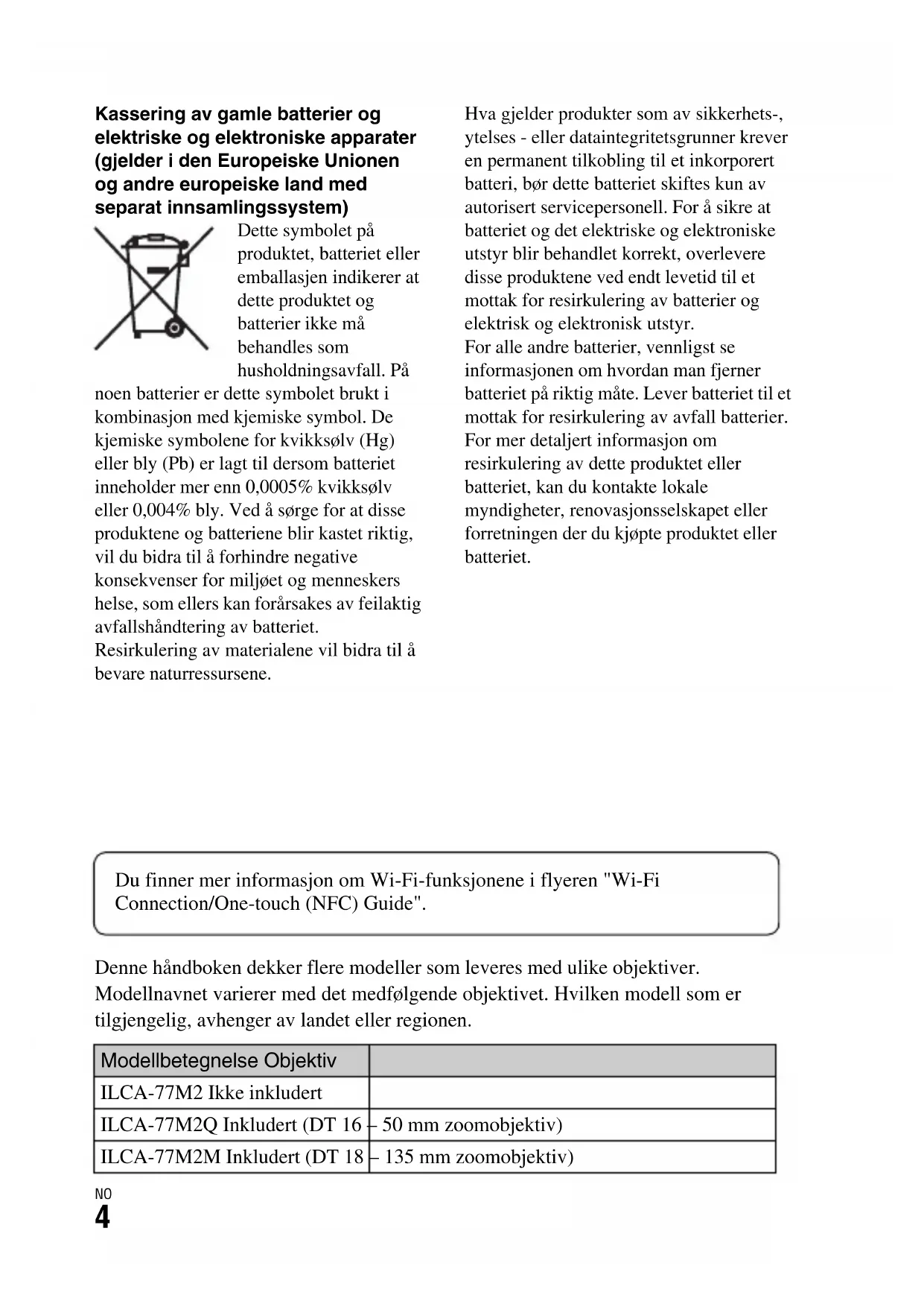 noen batterier er dette symbolet brukt i kombinasjon med kjemiske symbol. De kjemiske symbolene for kvikksølv (Hg) aller bly (Pb) er lagt til dersom batteriet inneholder mer enn 0,0005% kvikksølv aller 0,004% bly. Ved a sorge for at disse produitene og batteriene blir kastet riktig, vil du bidra til a forhindre negative konsekvenser for miljøet og mensengers helse, som ellers kan forarsakes av feilaktig avfallshandtering av batteriet.