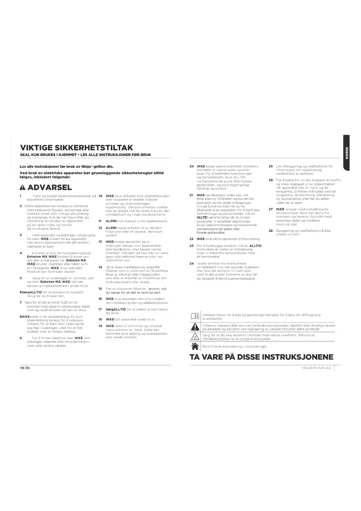 - Produktregistrering 15 116 ninjakitchen.eu NORSK Les alle instruksjoner før bruk av Ninja®-grillen din. Ved bruk av elektriske apparater bør grunnleggende sikkerhetsregler alltid følges, inkludert følgende: ADVARSEL 1 Fjern og kassér beskyttelsesdekselet på apparatets strømkabel. 2 Dette apparatet kan brukes av personer med reduserte fysiske, sensoriske eller mentale evner eller mangel på erfaring og kunnskap, hvis de har tilsyn eller gis veiledning om bruken av apparatet på en sikker måte og forstår de involverte farene. 3 Hold apparatet og ledningen utilgjengelig for barn. IKKE la barn bruke apparatet. Vær ekstra oppmerksom når det brukes i nærheten av barn. 4 Enheten er kun for husholdningsbruk. Enheten MÅ IKKE brukes til annet enn det den er beregnet for. Enheten MÅ IKKE brukes i kjøretøy eller båter som er i bevegelse. IKKE bruk utendørs. Misbruk kan forårsake skader. 5 Sørg for at underlaget er vannrett, tørt og rent. Enheten MÅ IKKE stå nær kanten av kjøkkenbenken under bruk. 6 Sørg ALLTID for at enheten er montert riktig før du bruker den. 7 Sørg for at det er minst 15,25 cm (6 tommer) med plass til luftsirkulasjon både over og rundt enheten når den er i bruk. 8 IKKE koble til en skjøteledning. En kort strømledning brukes for å redusere risikoen for at barn drar i eller setter seg fast i ledningen, eller for at folk snubler over en lengre ledning. 9 For å hindre elektrisk støt, IKKE sett ledninger, støpsler eller hovedenheten i vann eller andre væsker. 10 IKKE bruk enheten hvis strømledningen eller støpselet er skadet. Inspiser enheten og strømledningen regelmessig. Dersom enheten svikter eller er skadet, må du slutte å bruke den umiddelbart og ringe kundesenteret. 11 ALDRI bruk støpsel under kjøkkenbenk. 12 ALDRI koble enheten til en ekstern tidsbryter eller et separat, fjernstyrt system. 13 IKKE plasser apparatet og la ledningen henge over kjøkkendisk- eller bordkanter, eller berøre varme overlater, inkludert på eller nær en varm gass- eller elektrisk brenner eller i en oppvarmet ovn. 14 Bruk bare medfølgende, anbefalt tilbehør som er autorisert av SharkNinja. Bruk av tilbehør eller tilleggsutstyr som ikke er anbefalt av SharkNinja, kan forårsake brann eller skade. 15 Før du plasserer tilbehør i gryten, må du sørge for at det er rent og tørt. 16 IKKE bruk apparatet uten å ha installert den uttakbare gryten og sølebeskyttelsen. 17 Sørg ALLTID for at lokket er helt lukket før bruk. 18 IKKE flytt apparatet under bruk. 19 IKKE dekk til luftinntak og luftuttak mens enheten er i bruk. Dette kan forhindre jevn steking og overopphete eller skade enheten. 20 IKKE berør varme overflater. Enhetens overflater er varme under og etter bruk. For å forhindre forbrenninger og personskader, bruk ALLTID varmeisolerende puter eller forede grytevotter, og bruk tilgjengelige håndtak og knotter. 21 IKKE rør tilbehøret under eller rett etter steking. Grillplaten og kurven blir ekstremt varme under matlagingen. Unngå fysisk kontakt når du tar tilbehøret ut av apparatet. For å forhindre forbrenninger og personskader, må du ALLTID være forsiktig når du bruker produktet. Vi anbefaler deg å bruke lange kjøkkenredskaper og beskyttende varmeisolerende puter eller forede grytevotter. p. 1271