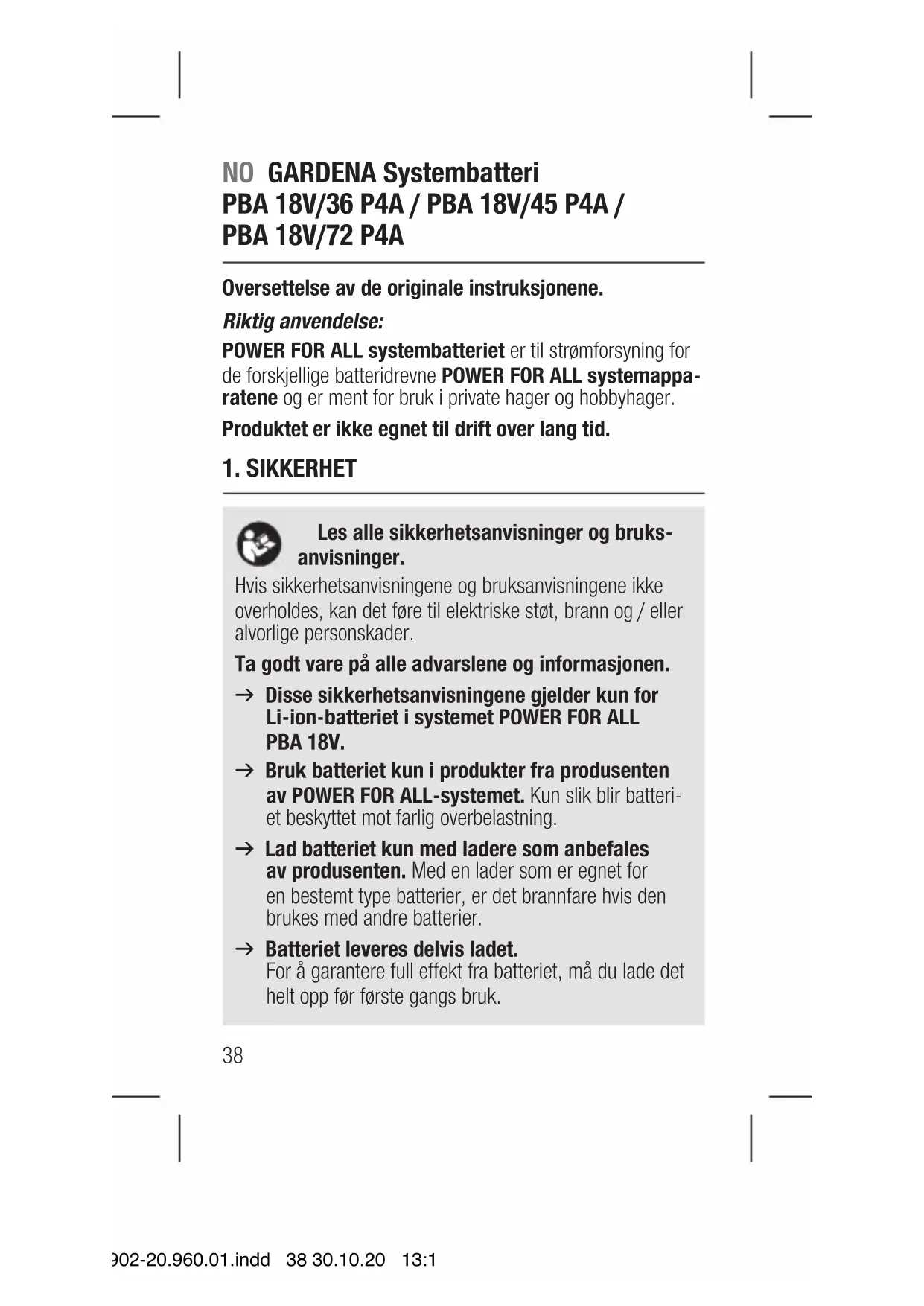 Oversettelse av de originale instruksjonene. Riktig anvendelse: POWER FOR ALL systembatteriet er til strømforsyning for de forskjellige batteridrevne POWER FOR ALL systemappa- ratene og er ment for bruk i private hager og hobbyhager. Produktet er ikke egnet til drift over lang tid.