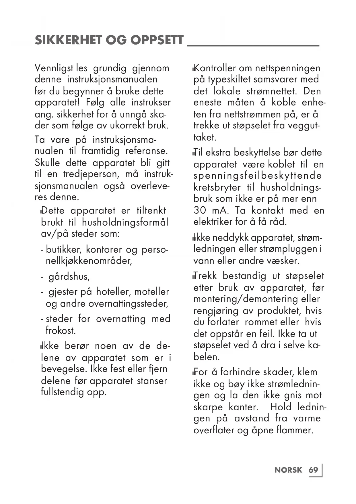 Posisjoner apparatet slik at strømpluggen alltid er tilgjen- gelig.72 NORSK HURTIG OVERSIKT
