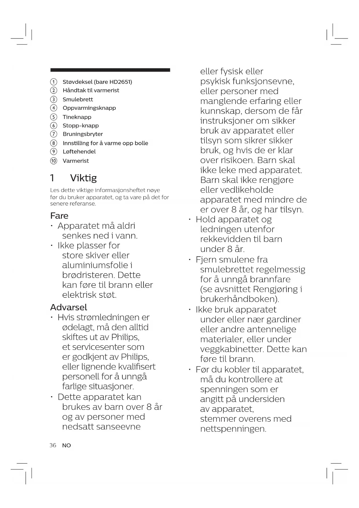 - Før du kobler til apparatet, må du kontrollere at spenningen som er angitt på undersiden av apparatet, stemmer overens med nettspenningen. a Støvdeksel (bare HD2651) b Håndtak til varmerist c Smulebrett d Oppvarmingsknapp e Tineknapp f Stopp-knapp g Bruningsbryter h Innstilling for å varme opp bolle i Løftehendel j Varmerist 1 Viktig Les dette viktige informasjonsheftet nøye før du bruker apparatet, og ta vare på det for senere referanse. Fare