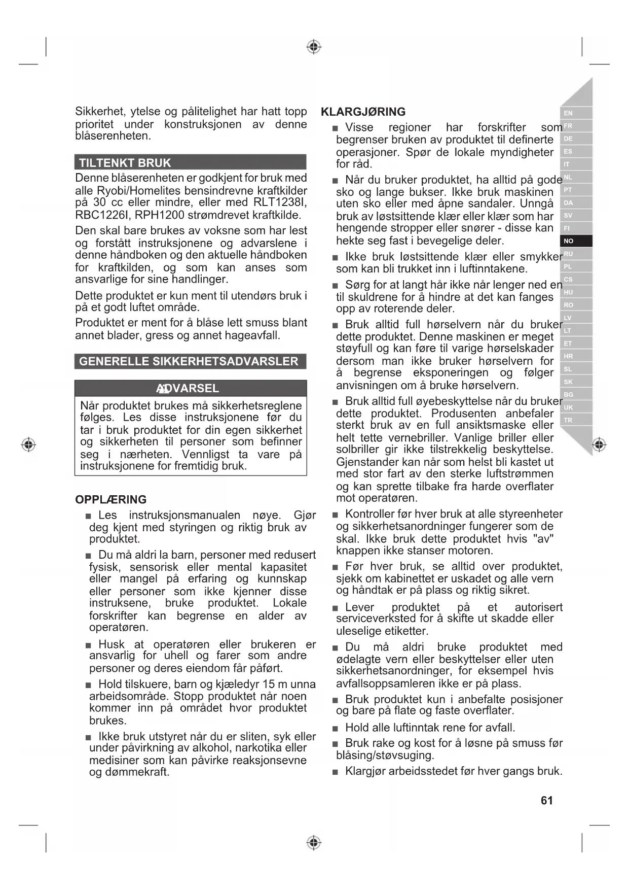 Sikkerhet, ytelse og pålitelighet har hatt topp prioritet under konstruksjonen av denne blåserenheten. TILTENKT BRUK Denne blåserenheten er godkjent for bruk med alle Ryobi/Homelites bensindrevne kraftkilder på 30 cc eller mindre, eller med RLT1238I, RBC1226I, RPH1200 strømdrevet kraftkilde. Den skal bare brukes av voksne som har lest og forstått instruksjonene og advarslene i denne håndboken og den aktuelle håndboken for kraftkilden, og som kan anses som ansvarlige for sine handlinger. Dette produktet er kun ment til utendørs bruk i på et godt luftet område. Produktet er ment for å blåse lett smuss blant annet blader, gress og annet hageavfall. GENERELLE SIKKERHETSADVARSLER ADVARSEL Når produktet brukes må sikkerhetsreglene følges. Les disse instruksjonene før du tar i bruk produktet for din egen sikkerhet og sikkerheten til personer som befinner seg i nærheten. Vennligst ta vare på instruksjonene for fremtidig bruk. OPPLÆRING ■ Les instruksjonsmanualen nøye. Gjør deg kjent med styringen og riktig bruk av produktet. ■ Du må aldri la barn, personer med redusert fysisk, sensorisk eller mental kapasitet eller mangel på erfaring og kunnskap eller personer som ikke kjenner disse instruksene, bruke produktet. Lokale forskrifter kan begrense en alder av operatøren. ■ Husk at operatøren eller brukeren er ansvarlig for uhell og farer som andre personer og deres eiendom får påført. ■ Hold tilskuere, barn og kjæledyr 15 m unna arbeidsområde. Stopp produktet når noen kommer inn på området hvor produktet brukes. ■ Ikke bruk utstyret når du er sliten, syk eller under påvirkning av alkohol, narkotika eller medisiner som kan påvirke reaksjonsevne og dømmekraft. KLARGJØRING ■ Visse regioner har forskrifter som begrenser bruken av produktet til definerte operasjoner. Spør de lokale myndigheter for råd. ■ Når du bruker produktet, ha alltid på gode sko og lange bukser. Ikke bruk maskinen uten sko eller med åpne sandaler. Unngå bruk av løstsittende klær eller klær som har hengende stropper eller snører - disse kan hekte seg fast i bevegelige deler. ■ Ikke bruk løstsittende klær eller smykker som kan bli trukket inn i luftinntakene. ■ Sørg for at langt hår ikke når lenger ned en til skuldrene for å hindre at det kan fanges opp av roterende deler. ■ Bruk alltid full hørselvern når du bruker dette produktet. Denne maskinen er meget støyfull og kan føre til varige hørselskader dersom man ikke bruker hørselvern for å begrense eksponeringen og følger anvisningen om å bruke hørselvern. ■ Bruk alltid full øyebeskyttelse når du bruker dette produktet. Produsenten anbefaler sterkt bruk av en full ansiktsmaske eller helt tette vernebriller. Vanlige briller eller solbriller gir ikke tilstrekkelig beskyttelse. Gjenstander kan når som helst bli kastet ut med stor fart av den sterke luftstrømmen og kan sprette tilbake fra harde overflater mot operatøren. ■ Kontroller før hver bruk at alle styreenheter og sikkerhetsanordninger fungerer som de skal. Ikke bruk dette produktet hvis "av" knappen ikke stanser motoren. ■ Før hver bruk, se alltid over produktet, sjekk om kabinettet er uskadet og alle vern og håndtak er på plass og riktig sikret. ■ Lever produktet på et autorisert serviceverksted for å skifte ut skadde eller uleselige etiketter. ■ Du må aldri bruke produktet med ødelagte vern eller beskyttelser eller uten sikkerhetsanordninger, for eksempel hvis avfallsoppsamleren ikke er på plass. ■ Bruk produktet kun i anbefalte posisjoner og bare på flate og faste overflater. ■ Hold alle luftinntak rene for avfall. ■ Bruk rake og kost for å løsne på smuss før blåsing/støvsuging. ■ Klargjør arbeidsstedet før hver gangs bruk.62 | Norsk Fjern alle gjenstander som steiner, knust glass, spiker, wire eller hyssing som kan bli slengt lange avstander med stor fart. For montering med bensindrevet kraftkilde ■ Start eller kjør aldri motoren på et avstengt eller delvis avstengt område. Å puste inn eksosgass kan drepe. ■ Ikke berør området rundt lyddemperen eller sylinder på produktet, da disse delene kan være varme etter drift. ■ Stopp alltid motoren, og la den avkjøles før du utfører vedlikeholdsarbeider. ■ Bland og oppbevar drivstoff i en beholder som er godkjent for drivstoff. ■ Bland brennstoffet utendørs, på et sted der det ikke finnes gnister eller åpen flamme. Tørk opp alt brennstoffsøl. Gå minst 9 m unna påfyllingsstedet for driftstoff før du starter motoren. ■ Stopp motoren og la den kjøle seg ned før fylling av drivstoff eller lagring av enheten. ■ La maskinen bli avkjølt. Tøm drivstofftanken og oljetanken (hvis aktuelt), og sikre enheten godt før den transporteres i et kjøretøy. For montering med elektrisk drevet kraftkilde ■ Strømpluggene må passe til kontaktene. Foreta aldri noen form for endringer av støpslet. Ikke bruk noen form for adapterstøpsel til jordet elektrisk verktøy. Umodifiserte støpsler og passende stikkontakter vil redusere risikoen for elektrisk støt. ■ Unngå utilsiktet start. Sjekk alltid at bryteren er i av-posisjon før du stikker pluggen i stikkontakten. Ikke bær produktet med fingeren på bryteren dersom det er koblet til strømmen. ■ Unngå kroppskontakt med jordede overflater, som vannrør, radiatorer, kokeapparater og kjøleaggregater. Det er økt risiko for elektrisk støt dersom kroppen din har kontakt med jord. ■ Ikke utsett produktet for regn eller høy fuktighet. Vann som trenger inn i produktet, vil øke faren for elektrisk støt. ■ Utstyret må få strøm fra en elektrisk kurs med jordfeilbryter som ikke overstiger 30 mA. ■ Før hver bruk skal strømledningen sjekkes for skader. Hvis det finnes tegn på skade, må ledningen skiftes ut av et autorisert servicested. Rull alltid ut ledningen under bruk for sammenrullede ledninger kan bli overopphetet. ■ Hvis den elektriske ledningen skades under bruk, trekk støp