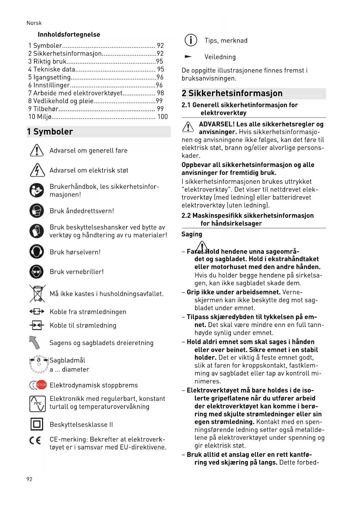 for håndsirkelsager Saging – Fare! Hold hendene unna sageområ det og sagbladet. Hold i ekstrahåndtaket eller motorhuset med den andre hånden. Hvis du holder begge hendene på sirkelsa gen, kan ikke sagbladet skade dem. – Grip ikke under arbeidsemnet. Verne skjermen kan ikke beskytte deg mot sag bladet under emnet. – Tilpass skjæredybden til tykkelsen på em net. Det skal være mindre enn en full tann høyde synlig under emnet. – Hold aldri emnet som skal sages i hånden eller over beinet. Sikre emnet i en stabil holder. Det er viktig å feste emnet godt, slik at faren for kroppskontakt, fastklem ming av sagbladet eller tap av kontroll mi nimeres. – Elektroverktøyet må bare holdes i de iso lerte gripeflatene når du utfører arbeid der elektroverktøyet kan komme i berø ring med skjulte strømledninger eller sin egen strømledning. Kontakt med en spen ningsførende ledning setter også metallde lene på elektroverktøyet under spenning og gir elektrisk støt. – Bruk alltid et anslag eller en rett kantfø ring ved skjæring på langs. Dette forbed Norsk 92rer skjærenøyaktigheten og reduserer mu ligheten for at sagbladet kommer i klem. – Bruk alltid sagblad i riktig størrelse og med passende festeåpning (f.eks. stjerne formet eller rund). Sagblader som ikke passer til monteringsdelene på sagene, vil rotere ujevnt og føre til tap av kontroll. – Bruk aldri skadde eller feil sagbladspenn flenser eller -skruer. Sagbladspennflen sene og -skruene er konstruert spesielt til din sag for å gi optimal ytelse og driftssik kerhet. Tilbakeslag – årsaker og sikkerhetsanvisnin ger – En rekyl er en plutselig reaksjon fra et sag blad som har huket eller klemt seg fast el ler er i feilstilling. Rekyl fører til at sagen løfter seg ukontrollert fra arbeidsemnet og mot brukeren; – hvis sagbladet setter seg fast i en sages palte som opphører, blokkeres det og mo torkraften slår apparatet mot brukeren; – hvis sagbladet blir fordreid i kuttet eller kommer i feil stilling, kan tennene i det bakre området av sagbladet sette seg fast i arbeidsemnet, noe som fører til at sagbla det fyker ut av sagespalten og mot bruke ren. Rekyl skyldes feil bruk av sagen. Det kan unn gås ved at man følger egnede sikkerhetstiltak som de nedenfor. – Hold sagen med begge hender og hold ar mene i en stilling som kan motvirke rekyl kreftene. Hold alltid sagbladet litt til siden for deg, aldri på linje med kroppen din. Ved rekyl kan sirkelsagen sprette bakover, men brukeren kan gjennom egnede tiltak takle rekylkreftene. – Hvis sagbladet kommer i klem eller du må avbryte arbeidet, må du slippe på/av-bry teren og holde sagen stødig i arbeidsem net til sagbladet står helt stille. Prøv aldri å ta sagen ut av arbeidsemnet eller trekke den bakover så lenge sagbladet er i beve gelse, ellers kan det oppstå rekyl. Finn og utbedre årsaken til at sagbladet kom i klem. – Hvis du vil starte en sag som står i ar beidsemnet, må du sentrere sagbladet i sagesporet og kontrollere at sagtennene ikke står fast i arbeidsemnet. Hvis sagbla det er i klem, kan det bevege seg ut av verktøyet eller forårsake rekyl når sagen startes på nytt. – Støtt opp store plater for å unngå fare for tilbakeslag på grunn av et sagblad som kommer i klem. Store plater kan bøye seg under sin egen vekt. Støtt derfor opp plate ne på begge sider, både i nærheten av sag esporet og langs kanten. – Ikke bruk sløve eller skadde sagblader. Sagblader med sløve eller feiljusterte ten ner forårsaker økt friksjon, at sagbladet kommer i klem og rekyl på grunn av for smalt sagespor. – Før sagingen må du stramme til skjære dybde- og skjærevinkelinnstillingene. Dersom innstillingene endrer seg under sagingen, kan sagbladet sette seg fast og forårsake rekyl. – Vær spesielt forsiktig ved "dykkutt" i eksi sterende vegger eller andre områder du ikke kan se. Sagblader som dykker ned i arbeidsemnet, kan blokkeres av skjulte ob jekter i områder du ikke kan se, og forårsa ke rekyl. Verneskjermens funksjoner – Hver gang før bruk må du kontrollere at verneskjermen lukkes som den skal. Ikke bruk sagen hvis verneskjermen ikke beve ges fritt og ikke lukkes umiddelbart. Du må aldri klemme fast eller binde fast ver neskjermen. I så fall vil sagbladet være ubeskyttet. Hvis du uforvarende mister sagen i gulvet, kan verneskjermen bli bøyd. Påse at verneskjermen beveges fritt og ik ke kommer i berøring med sagbladet eller andre deler i noen som helst skjærevinkler og -dybder. – Kontroller tilstanden og funksjonen til fjæren i verneskjermen. Gjennomfør ved likehold på apparatet før bruk dersom verneskjerm og fjær ikke fungerer som de skal. Skadde deler, klistrende avleiringer eller oppsamling av spon fører til at verne skjermen reagerer tregt. – Ved "dykkutt" som ikke utføres i rett vin kel, må du sikre grunnplaten mot å for skyves. Forskyvning til siden føre til at sag bladet klemmes fast og det kan oppstå re kyl. – Ikke legg sagen på arbeidsbenken eller gulvet uten at verneskjermen dekker sag bladet. Et ubeskyttet sagblad som ikke har stanset helt, beveger sagen mot sageret ningen og sager det som står i veien for den. Ta hensyn til sagens etterløpstid. Norsk 93Spalteknivens funksjon – Bruk sagblad som passer til spaltekniven. For at spaltekniven skal fungere, må stam bladet være tynnere enn sagbladet og tann bredden være større enn spalteknivtykkel sen. – Juster spaltekniven som beskrevet i den ne bruksanvisningen. Feil avstander, posi sjon og justering kan føre til at spaltekni ven ikke hindrer tilbakeslag effektivt. – For at spaltekniven skal kunne fungere, må den befinne seg i sagespalten. Ved korte kutt klarer ikke spaltekniven å for hindre rekyl. – Ikke bruk sagen hvis spaltekniven er bøyd. Selv et svakt avvik kan føre til at verne skjermen lukker seg langsommere.