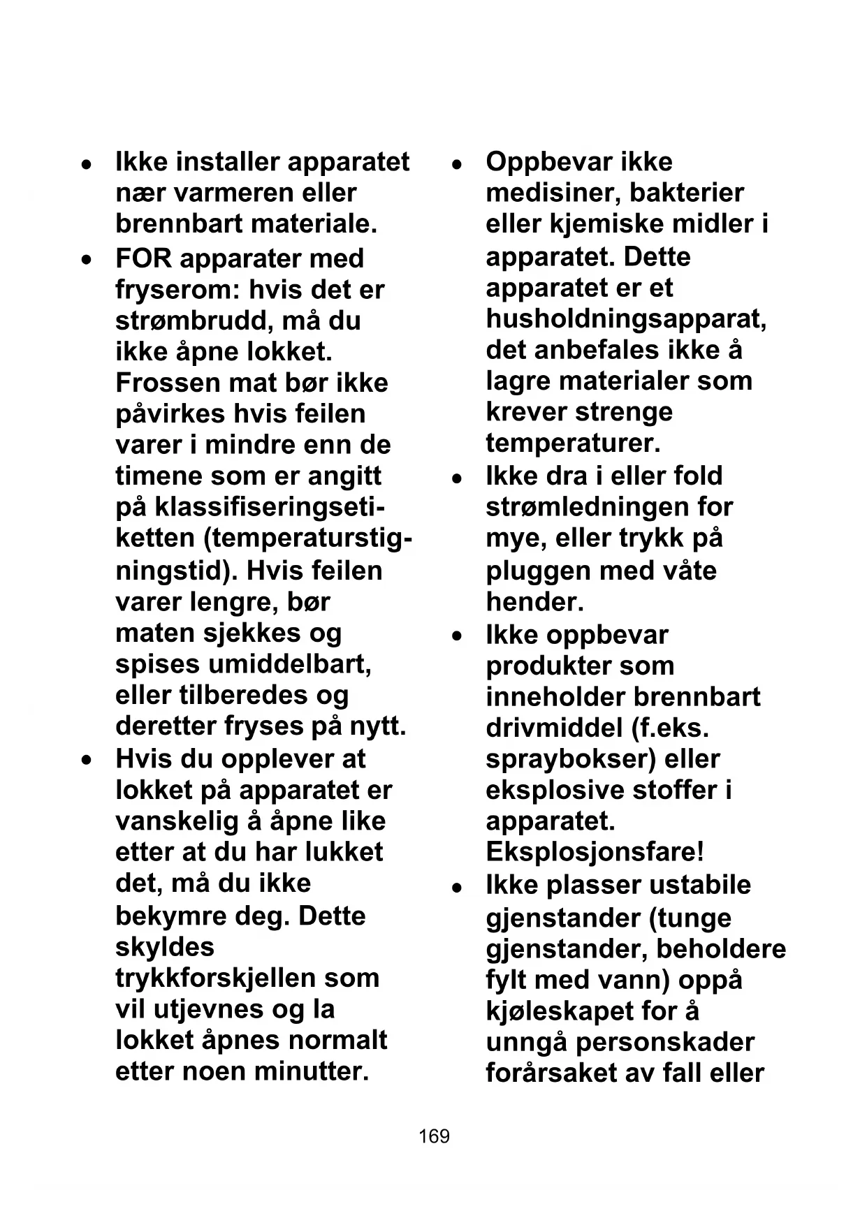 Ikke oppbevar produkter som inneholder brennbart drivmiddel (f.eks. spraybokser) eller eksplosive stoffer i apparatet. Eksplosjonsfare!