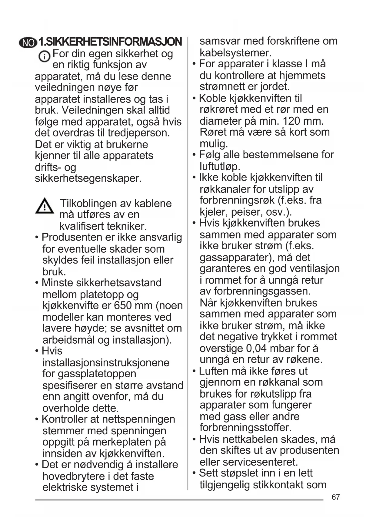 - Udskiftning skal ske hos det tekniske servicecenter. Bestilling kan ske hos det tekniske servicecenter.67 1.SIKKERHETSINFORMASJON For din egen sikkerhet og en riktig funksjon av apparatet, må du lese denne veiledningen nøye før apparatet installeres og tas i bruk. Veiledningen skal alltid følge med apparatet, også hvis det overdras til tredjeperson. Det er viktig at brukerne kjenner til alle apparatets drifts- og sikkerhetsegenskaper. Tilkoblingen av kablene må utføres av en kvalisert tekniker.