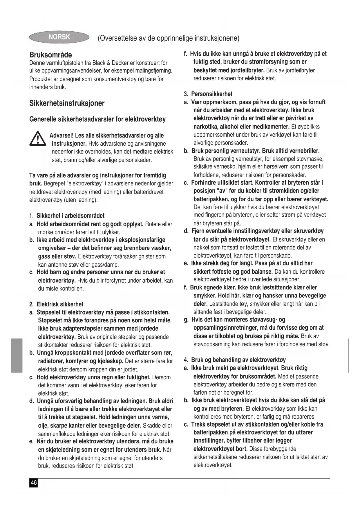 Advarsel! Ekstra sikkerhetsinstruksjoner for varmluftpistoler.