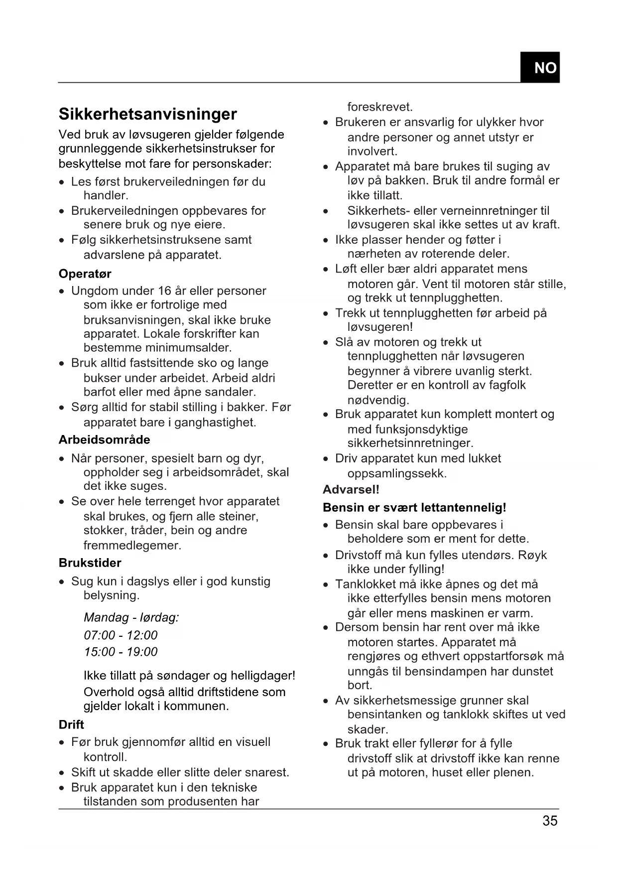 - Bruk utelukkende originale reservedeler og originalt tilbehør. Konstruksjons- og utførelsesendringer forbeholdt. Sikkerhetsinnretninger Sikkerhetsbøyle Slipp opp sikkerhetsbøylen i faremomentet, motor og sugeverk stanses. Funksjonen til sikkerhetsbøylen må ikke settes ut av drift. Betydningen til symbolene på apparatet Les bruksanvisningen! Hold personer som står i nærheten på avstand! Trekk ut tennplugghetten før arbeid på løvsugeren! Forsiktig! Fare! Hold hender og føtter unna innsugingskanalen! Løsne motorbremsen. I denne bruksanvisningen Fare! Ved manglende overholdelse fare for personskader. Montering For monteringen av dette apparatet følg monteringsanvisningen vedlagt separat. Miljøvern, avfallsbehandling Apparater som ikke lenger skal brukes, skal ikke kastes i vanlig husholdningsavfall! Emballasje, maskin og tilbehør er laget av gjenvinnbare materialer og skal deponeres tilsvarende. Igangsetting Apparatet skal først tas i bruk når monteringen er fullstendig gjennomført. Tallet som er skrevet til venstre for teksten (f.eks. (1)) viser til illustrasjonene. Følg den medfølgende bruksanvisningen fra motorprodusenten. Fyll olje og bensin før første oppstart! Bensin: Normalbensin - blyfri Motorolje: Se bruksanvisningen til motorprodusenten Fyll på bensin: Tanklokket befinner seg på bensintanken, og er merket med symbolet "bensinpumpe" (bensinstasjon). Fyll på olje: fyllmengde, ca. 0,6 liter. Motor uten oljepeilepinne: Fyll på til øvre kant på påfyllingsstussen. Motor med oljepeilepinne: Fyll på til merket mellom "FULL" og "ADD" på oljepeilepinnen. Oljepeilepinnen skrus inn for å kontrollere oljenivået. Starte motoren a) Uten gassfjernkontroll (1) Trykk primerknapp 3x, med ca. 2 sekunders mellomrom. Trykk primerknappen 5x ved temperaturer under 10 °C. Bruk ikke primerknappen ved driftsvarm motor! (2) Trekk motorbremsebøylene til øvre håndtak og hold fast - motorbremsebøylen går ikke i lås. (3) Dra startsnoren raskt ut, og la den deretter rulles sakte tilbake igjen.37