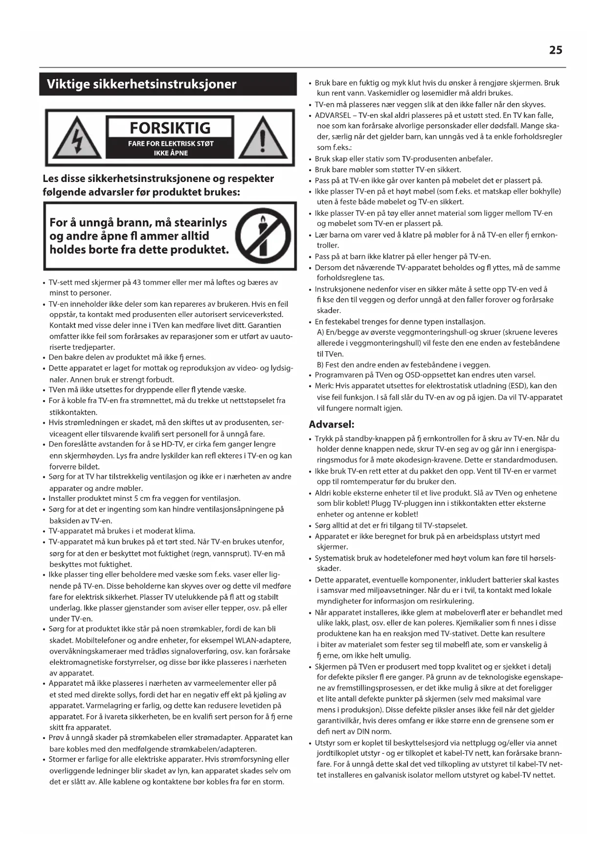 - TV-sett med skjermer på 43 tommer eller mer må løftes og bæres av minst to personer.• TV-en inneholder ikke deler som kan repareres av brukeren. Hvis en feil oppstår, ta kontakt med produsenten eller autorisert serviceverksted. Kontakt med visse deler inne iTVen kan medføre livet ditt. Garantien omfatter ikke feil som forårsakes av reparasjoner som er utført av uauto-riserte tredjeparter.• Den bakre delen av produktet må ikke ernes.• Dette apparatet er laget for mottak og reproduksjon av video- og lydsig-naler. Annen bruk er strengt forbudt.• TVen må ikke utsettes for dryppende eller ytende væske.• For å koble fra TV-en fra strømnettet, må du trekke ut nettstøpselet fra stikkontakten.• Hvis strømledningen er skadet, må den skiftes ut av produsenten, ser-viceagent eller tilsvarende kvali sert personell for å unngå fare.• Den foreslåtte avstanden for å se HD-TV, er cirka fem ganger lengre enn skjermhøyden. Lys fra andre lyskilder kan re ekteres iTV-en og kan forverre bildet.• Sørg for at TV har tilstrekkelig ventilasjon og ikke er inærheten av andre apparater og andre møbler.• Installer produktet minst 5 cm fra veggen for ventilasjon.• Sørg for at det er ingenting som kan hindre ventilasjonsåpningene på baksiden av TV-en.• TV-apparatet må brukes iet moderat klima.• TV-apparatet må kun brukes på et tørt sted. Når TV-en brukes utenfor, sørg for at den er beskyttet mot fuktighet (regn, vannsprut). TV-en må beskyttes mot fuktighet.• Ikke plasser ting eller beholdere med væske som f.eks. vaser eller lig-nende på TV-en. Disse beholderne kan skyves over og dette vil medføre fare for elektrisk sikkerhet. Plasser TV utelukkende på att og stabilt underlag. Ikke plasser gjenstander som aviser eller tepper, osv. på eller under TV-en.• Sørg for at produktet ikke står på noen strømkabler, fordi de kan bli skadet. Mobiltelefoner og andre enheter, for eksempel WLAN-adaptere, overvåkningskameraer med trådløs signaloverføring, osv. kan forårsake elektromagnetiske forstyrrelser, og disse bør ikke plasseres inærheten av apparatet.• Apparatet må ikke plasseres inærheten av varmeelementer eller på et sted med direkte sollys, fordi det har en negativ eff ekt på kjøling av apparatet. Varmelagring er farlig, og dette kan redusere levetiden på apparatet. For å ivareta sikkerheten, be en kvali sert person for å erne skitt fra apparatet.• Prøv å unngå skader på strømkabelen eller strømadapter. Apparatet kan bare kobles med den medfølgende strømkabelen/adapteren.• Stormer er farlige for alle elektriske apparater. Hvis strømforsyning eller overliggende ledninger blir skadet av lyn, kan apparatet skades selv om det er slått av. Alle kablene og kontaktene bør kobles fra før en storm.• Bruk bare en fuktig og myk klut hvis du ønsker å rengjøre skjermen. Bruk kun rent vann. Vaskemidler og løsemidler må aldri brukes.• TV-en må plasseres nær veggen slik at den ikke faller når den skyves.• ADVARSEL – TV-en skal aldri plasseres på et ustøtt sted. En TV kan falle, noe som kan forårsake alvorlige personskader eller dødsfall. Mange ska-der, særlig når det gjelder barn, kan unngås ved å ta enkle forholdsregler som f.eks.:• Bruk skap eller stativ som TV-produsenten anbefaler.• Bruk bare møbler som støtter TV-en sikkert.• Pass på at TV-en ikke går over kanten på møbelet det er plassert på.• Ikke plasser TV-en på et høyt møbel (som f.eks. et matskap eller bokhylle) uten å feste både møbelet og TV-en sikkert.• Ikke plasser TV-en på tøy eller annet material som ligger mellom TV-en og møbelet som TV-en er plassert på.• Lær barna om varer ved å klatre på møbler for å nå TV-en eller ernkon-troller.• Pass på at barn ikke klatrer på eller henger på TV-en.• Dersom det nåværende TV-apparatet beholdes og yttes, må de samme forholdsreglene tas.• Instruksjonene nedenfor viser en sikker måte å sette opp TV-en ved å kse den til veggen og derfor unngå at den faller forover og forårsake skader.• En festekabel trenges for denne typen installasjon.A) En/begge av øverste veggmonteringshull-og skruer (skruene leveres allerede iveggmonteringshull) vil feste den ene enden av festebåndene til TVen.B) Fest den andre enden av festebåndene iveggen.• Programvaren på TVen og OSD-oppsettet kan endres uten varsel.• Merk: Hvis apparatet utsettes for elektrostatisk utladning (ESD), kan den vise feil funksjon. I så fall slår du TV-en av og på igjen. Da vil TV-apparatet vil fungere normalt igjen. Advarsel: