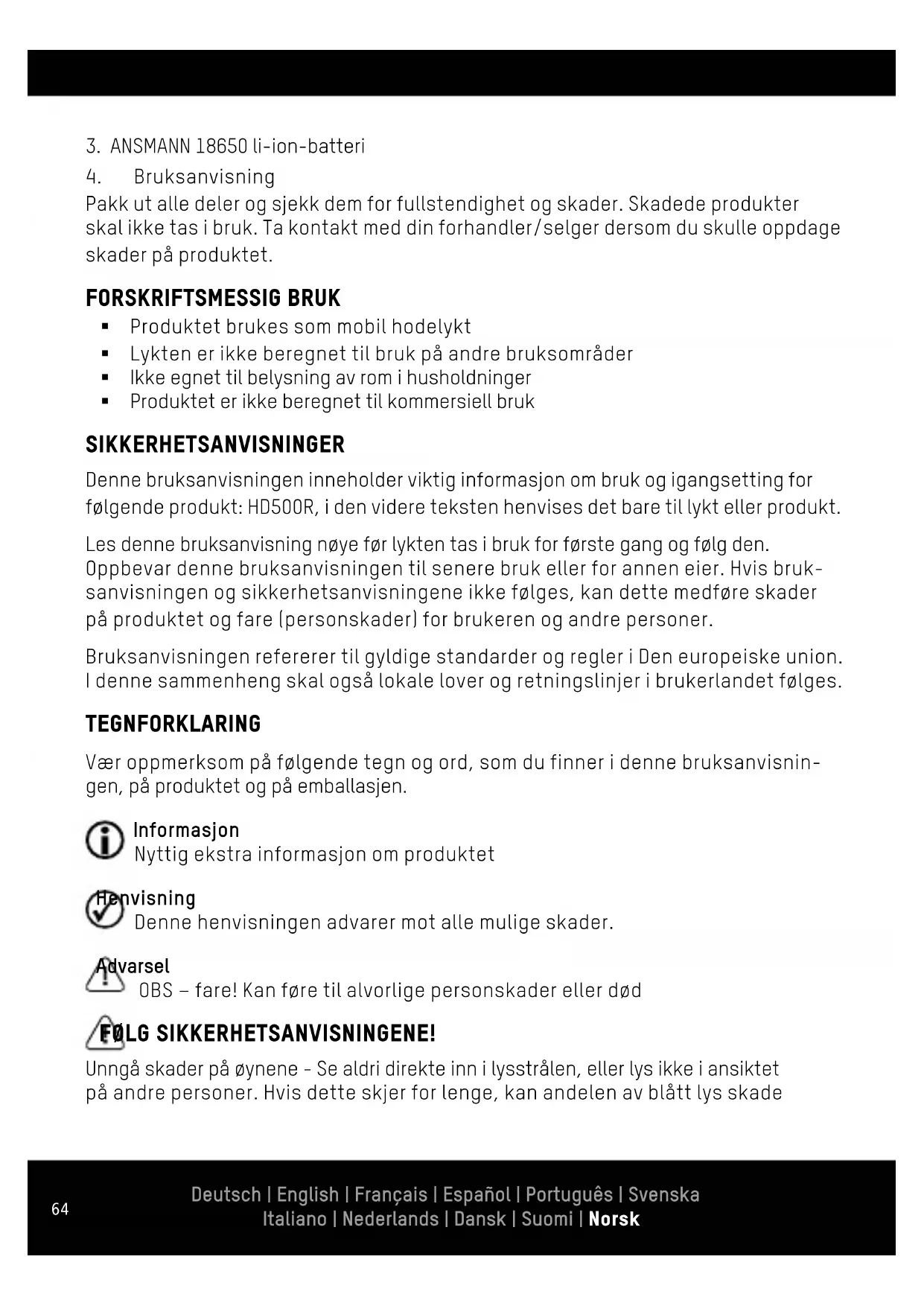 Pakk ut alle deler og sjekk dem for fullstendighet og skader. Skadede produkter skal ikke tas i bruk. Ta kontakt med din forhandler/selger dersom du skulle oppdage skader på produktet. FORSKRIFTSMESSIG BRUK § Produktet brukes som mobil hodelykt § Lykten er ikke beregnet til bruk på andre bruksområder § Ikke egnet til belysning av rom i husholdninger § Produktet er ikke beregnet til kommersiell bruk SIKKERHETSANVISNINGER Denne bruksanvisningen inneholder viktig informasjon om bruk og igangsetting for følgende produkt: HD500R, i den videre teksten henvises det bare til lykt eller produkt. Les denne bruksanvisning nøye før lykten tas i bruk for første gang og følg den. Oppbevar denne bruksanvisningen til senere bruk eller for annen eier. Hvis bruk- sanvisningen og sikkerhetsanvisningene ikke følges, kan dette medføre skader på produktet og fare (personskader) for brukeren og andre personer. Bruksanvisningen refererer til gyldige standarder og regler i Den europeiske union. I denne sammenheng skal også lokale lover og retningslinjer i brukerlandet følges. TEGNFORKLARING Vær oppmerksom på følgende tegn og ord, som du finner i denne bruksanvisnin- gen, på produktet og på emballasjen. Informasjon Nyttig ekstra informasjon om produktet Henvisning Denne henvisningen advarer mot alle mulige skader. Advarsel OBS – fare! Kan føre til alvorlige personskader eller død FØLG SIKKERHETSANVISNINGENE! Unngå skader på øynene - Se aldri direkte inn i lysstrålen, eller lys ikke i ansiktet på andre personer. Hvis dette skjer for lenge, kan andelen av blått lys skade Deutsch | English | Français | Español | Português | Svenska Italiano | Nederlands | Dansk | Suomi | Norsk Deutsch | English | Français | Español | Português | Svenska Italiano | Nederlands | Dansk | Suomi | Norsk65 netthinnen. Hvis en lysstråle treffer øynene, skal øynene lukkes og hodet vendes bort fra lysstrålen. Denne lampen overskrider vilkårene for farefri bruk. Risikoen forbundet med bruk avhenger av hvordan brukeren håndterer lampen. Risikogruppe fare avstand (HD) (2) 2 0m – 3,59m 1 3,59m – 35,90m Gratis gruppe > 35,90m (1) Denne verdien viser hvor mye grensen til den nest laveste risikogruppen er overskredet. Grenseverdien er 1. (2) Avstanden fra øynene til lampen for hver gruppe. § Produktet skal ikke åpnes eller endres! Reparasjonsarbeid skal bare utføres av produsen- ten, eller en servicetekniker som er autorisert av ham eller en lignende kvalifisert person. § Hold barn unna produktet og emballasjen. Produktet er ikke noe leketøy. Pass på at barn ikke leker med dette produktet. § Dette produktet er ikke beregnet til å brukes av personer (også barn) med nedsatte fysiske, sensoriske eller mentale evner eller manglende erfaring og/eller kunnskap om bruk av dette produktet. Slike personer må først instrueres av en person som er ansvarlig for deres sikkerhet eller være under tilsyn når de betjener produktet! § LED-lyskilden kan ikke skiftes ut. Når LED-lyskildens levetid ender, må hele lykten skiftes ut § Alle gjenstander som skal belyses må befinne seg i en avstand på minst 10 cm fra lykten! § Lykten skal kun brukes i henhold til beregnet bruk. § Produktet er ikke noe leketøy. § Produktet må oppbevares utilgjengelig for barn! § Manglende overholdelse av sikkerhetsanvisningene kan føre til skader på enheten eller til alvorlige personskader! § Produktet skal alltid holdes tørt Deutsch | English | Français | Español | Português | Svenska Italiano | Nederlands | Dansk | Suomi | Norsk RISKGRUPPE 2 FORSIKTIG Farlig optisk stråling kan produseres av dette produktet. Ikke sett inn lampen under bruk i lang tid. Kan være skadelig for øynene.66 OBS: § Produktet er utstyrt med et utskiftbart li-ion-batteri. Produktet må ikke kastes i åpen ild! § Produktet skal kun lades i lukkede, tørre og romslige rom, adskilt fra brennbare materialer og væsker. Manglende overholdelse kan føre til brannskader og branner. § Du må aldri forsøke å åpne, knuse, varme opp eller brenne et batteri. § Produktet skal ikke brukes i eksplosjonsfarlige omgivelser og i regnvær og ikke utsettes for sterk varme. § Produktet skal ikke brukes hvis produktet ser ut til å være skadet