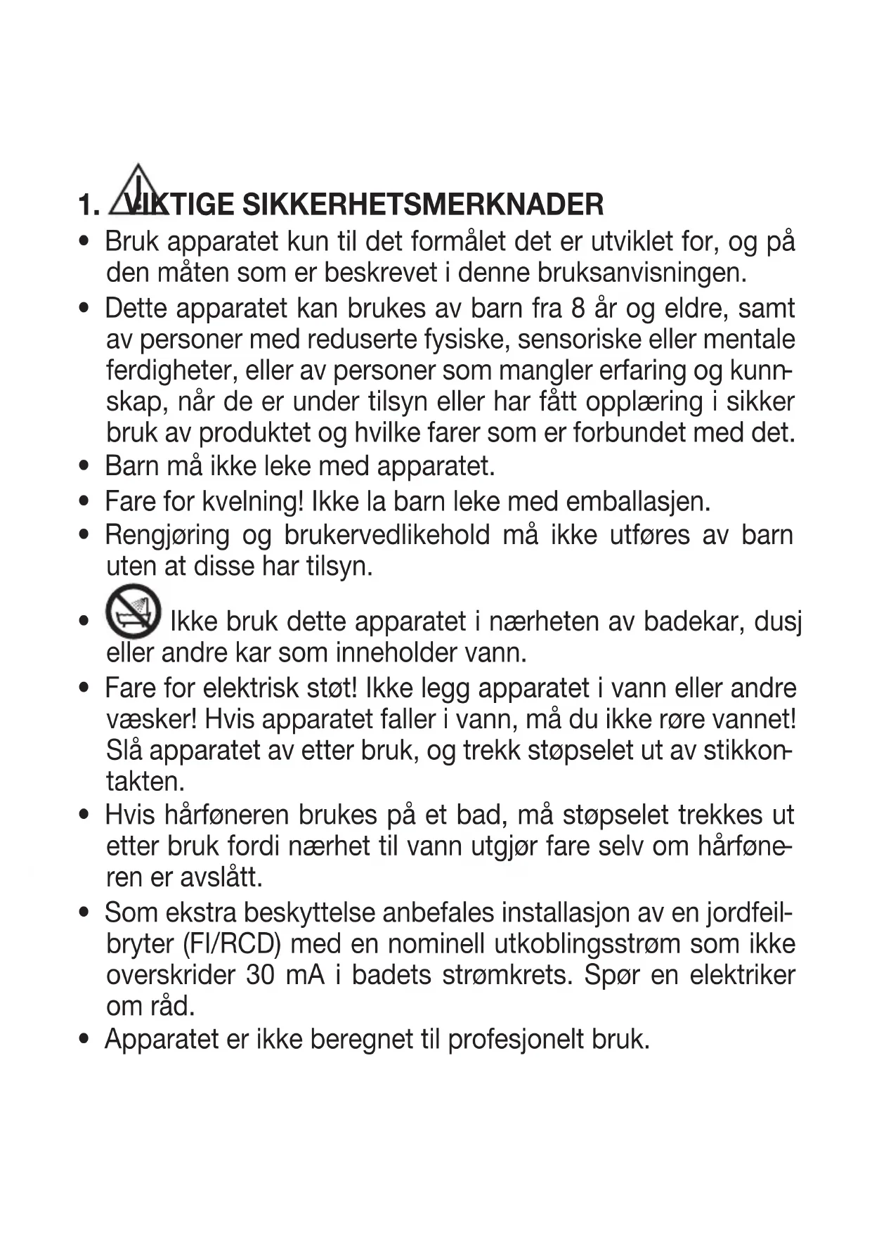 Følgende symboler brukes på selve apparatet, i bruksanvisningen, på emballasjen og på apparatets typeskilt: Apparatet må ikke brukes i nærheten av eller i vann (f.eks. servant, dusj, bade- kar) – fare for elektrisk støt! Advarsel om fare for personskader eller helserisiko.
