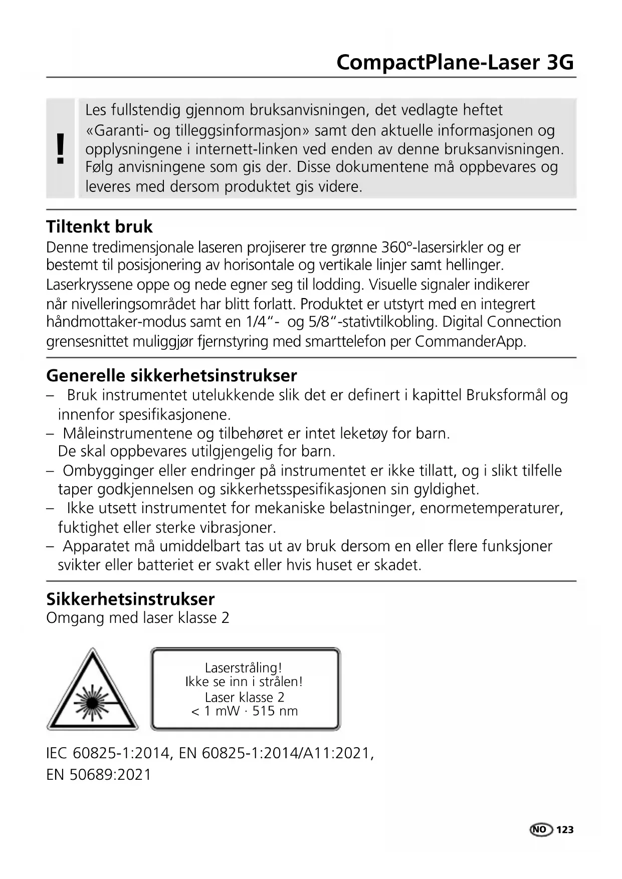 Tiltenkt bruk Denne tredimensjonale laseren projiserer tre grønne 360°-lasersirkler og er bestemt til posisjonering av horisontale og vertikale linjer samt hellinger. Laserkryssene oppe og nede egner seg til lodding. Visuelle signaler indikerer når nivelleringsområdet har blitt forlatt. Produktet er utstyrt med en integrert håndmottaker-modus samt en 1/4“- og 5/8“-stativtilkobling. Digital Connection grensesnittet muliggjør fjernstyring med smarttelefon per CommanderApp. Generelle sikkerhetsinstrukser – Bruk instrumentet utelukkende slik det er denert i kapittel Bruksformål og innenfor spesikasjonene. – Måleinstrumentene og tilbehøret er intet leketøy for barn. De skal oppbevares utilgjengelig for barn. – Ombygginger eller endringer på instrumentet er ikke tillatt, og i slikt tilfelle taper godkjennelsen og sikkerhetsspesikasjonen sin gyldighet. – Ikke utsett instrumentet for mekaniske belastninger, enormetemperaturer, fuktighet eller sterke vibrasjoner. – Apparatet må umiddelbart tas ut av bruk dersom en eller ere funksjoner svikter eller batteriet er svakt eller hvis huset er skadet. Sikkerhetsinstrukser Omgang med laser klasse 2