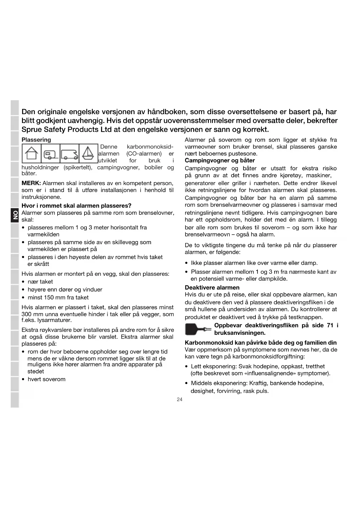 Sleep Easy Alarmen vil fortsatt varsle om CO i modusen Sleep Easy, men du må bytte ut alarmen innen sju dager. Teknisk informasjon Sensorens levetid: 10 år - Bytt enheten etter 10 års bruk Alarmens volumnivå: 85 dB ved 1 m / 3 feet Batterilevetid: 10 år ved normal bruk Temperaturintervall:-10 ºC (14 ºF) til 40 ºC (104 ºF) Fuktighetsintervall: 30 - 90 % RF Sertisert: Denne karbonmonoksidvarsleren er utviklet for å overvåke CO-nivået kontinuerlig. Responstidene er i tråd med kravene i den Europeiske standarden EN 50291- 1: 201050291-2 2010. ADVARSEL: Alarmer som overholder denne standarden, kan muligens ikke beskytte personer som har ytterligere risiko knyttet til CO-eksponering på grunn av alder, graviditet eller medisinsk tilstand. Ta kontakt med lege om du er i tvil. En karbonmonoksidvarsler er ikke en erstatning for røyk- eller brennbar gassvarsler. ADVARSEL: Hvis du oppholder deg for lenge nær varsleren når alarmen går, kan du få hørselsskader. Batteriene kan få redusert levetid hvis de utsettes for svært høye eller lave temperaturer. Vedlikehold Hvis du installerer CO-varsleren i en campingvogn eller på en båt, kan det nnes andre stoffer i nærheten som kan påvirke påliteligheten til CO-alarmen. Unngå å bruke oljer, rengjøringsmidler, voks, maling og fett i nærheten. Avhending I henhold til WEEE-direktiv 2012/19/EU, skal ikke elektrisk avfall avhendes sammen med vanlig husholdningsavfall. Batteripakken skal deaktiveres før avhending. For å gjøre dette setter du de to endene av metallclipsen som sitter på enden av deaktiveringsnøkkelen inn i deaktiveringskontakten på undersiden av detektoren. Dersom deaktiveringsnøkkelen ikke lenger er tilgjengelig, kan du lage en ny clips ved å forme en metallbinders til en U-form. Garanti Hva er dekket? Denne garantien dekker kun det opprinnelige kjøpet av NM-CO-10X-INT. Hvor lenge gjelder garantien? Denne garantien varer i ti år fra kjøpsdato. Hva dekker garantien? Denne garantien dekker produkt- eller produksjonsfeil. Hva er ikke dekt av garantien? Denne garantien dekker ikke skader som følge av ulykke, feil bruk, demontering, misbruk eller hvis du ikke tar ordentlig vare på produktet. Den gjelder heller ikke for hendelser eller forhold som naturkatastrofer (brann, ekstremvær osv.) som Sprue ikke har kontroll over. Denne garantien gjelder ikke for batteriene da det er brukerens ansvar å bytte disse. Kundeservice: Hvis du ønsker å levere tilbake produktet, må du legge ved kvitteringen og sende dette til: Sprue Safety Products, Vanguard Centre, Sir William Lyons Road, Coventry, CV4 7EZ, England. Fullstendig garantiinformasjon nner du på Internett: www.reangel.euSE