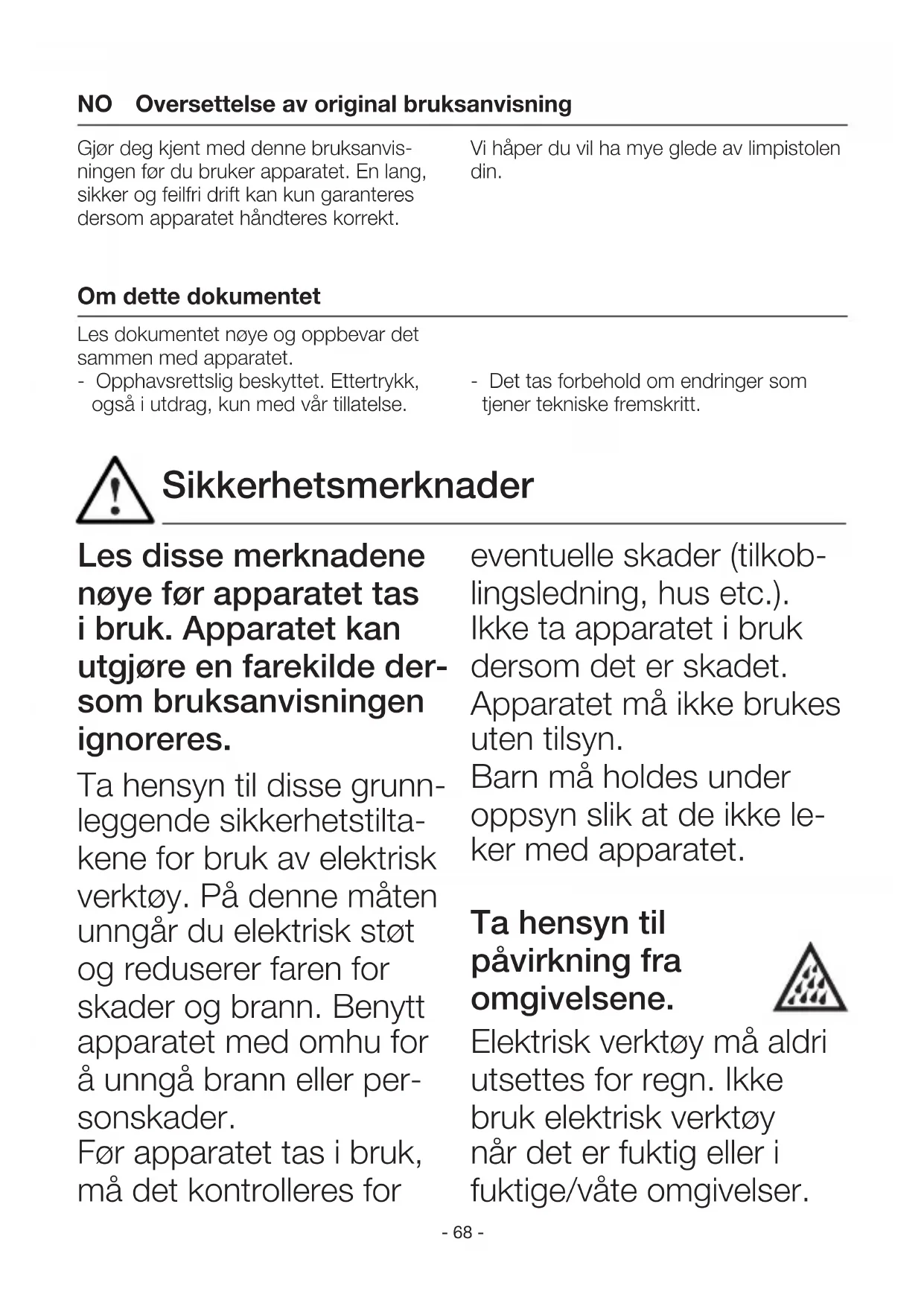 Vær forsiktig ved bruk av apparatene i nærheten av brennbare materialer. Ikke hold apparatet for lenge mot ett og samme punkt. Ikke bruk apparatet i po- tensielt eksplosive omgi- velser. Varme som slipper ut, kan ledes til brennbare materialer som befinner seg under overflaten. Beskytt deg selv mot elektrisk støt. Unngå å berøre jordete deler som f.eks. rør, ra- diatorer, komfyrer, kjøle- skap. Ikke la apparatet ligge uten tilsyn så lenge det er på. Oppbevar verktøyet på et sikkert sted. La apparatet ligge på støtten til avkjøling før det legges bort. Når verktøyet ikke er i bruk, må det oppbevares i tørre, stengte rom og utilgjengelig for barn. Det- te apparatet kan brukes av barn fra og med 8 år, personer med reduserte fysiske, sensoriske eller mentale evner eller per- soner med manglende erfaring og kunnskap. Forutsetningen er at de er under tilsyn eller har fått opplæring i sikker bruk av apparatet og har forstått farene ved bruk av appa- ratet. Barn skal ikke leke med apparatet. Rengjøring og vedlikehold skal ikke utføres av barn uten tilsyn. Verktøyet må ikke overbelastes. Du arbeider best og sik- rest innenfor angitt effekt- område. Ikke bær verk- tøyet i ledningen, og ikke Sikkerhetsmerknader- 70 - dra i verktøyet når du skal ta støpselet ut av stikkon- takten. Beskytt ledningen mot varme, olje og skarpe kanter. Vær oppmerksom på giftig gass og antennelsesfare. Under bearbeiding av plast, maling og lignende materialer kan det oppstå giftige gasser. Vær oppmerksom på brann- og eksplosjons- fare. For din egen sikkerhets skyld bør du kun bruke tilbehør og tilleggsappara- ter som er nevnt i bruks- anvisningen eller som anbefales av verktøyspro- dusenten. Bruk av annet verktøy eller tilbehør enn det som står oppført i bruksanvis- ningen eller i katalogen, kan medføre fare for personskader. Reparasjoner skal kun utføres av elektriker. Dette elektriske verktøyet oppfyller kravene i gjeld- ende sikkerhetsbestem- melser. Reparasjoner skal kun utføres av elektriker, noe annet vil kunne med- føre fare for brukeren. Hvis det oppstår skader på apparatets strømled- ning, må den skiftes ut av produsenten, produsen- tens kundeservice eller av personer med tilsvarende kvalifikasjoner. På denne måten unngår du fare. Oppbevar disse sikkerhetsinstruksene sammen med apparatet. Sikkerhetsmerknader- 71 -