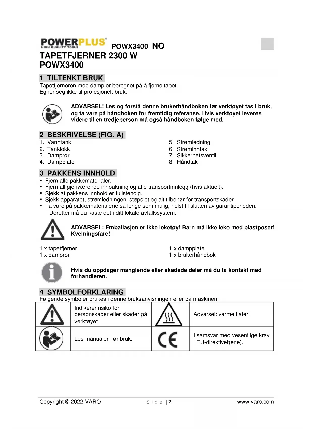 Copyright © 2022 VARO S i d e | 2 www.varo.com TAPETFJERNER 2300 W POWX3400 1 TILTENKT BRUK Tapetfjerneren med damp er beregnet på å fjerne tapet. Egner seg ikke til profesjonelt bruk. ADVARSEL! Les og forstå denne brukerhåndboken før verktøyet tas i bruk, og ta vare på håndboken for fremtidig referanse. Hvis verktøyet leveres videre til en tredjeperson må også håndboken følge med. 2 BESKRIVELSE (FIG. A)