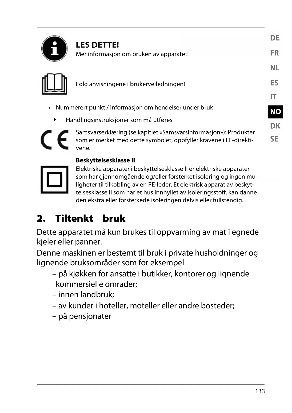 Dette apparatet må kun brukes til oppvarming av mat i egnede kjeler eller panner. Denne maskinen er bestemt til bruk i private husholdninger og lignende bruksområder som for eksempel – på kjøkken for ansatte i butikker, kontorer og lignende kommersielle områder; – innen landbruk; – av kunder i hoteller, moteller eller andre bosteder; – på pensjonater 18490 ML-Int.Sales Content 5006 8296 Final rev1.indb 13318490 ML-Int.Sales Content 5006 8296 Final rev1.indb 133 08.10.2021 12:14:5408.10.2021 12:14:54134 Maskinen er ikke ment til kommersiell og industriell bruk. Vi gjør oppmerksom på at garantien blir ugyldig ved ikke-til- tenkt bruk av maskinen: Ikke bygg om maskinen uten vårt samtykke og bruk bare til- leggsutstyr som er levert eller godkjent av oss. Bruk bare reserve- og tilbehørsdeler som er levert eller god- kjent av oss. Ta all informasjon i denne brukerveiledningen til følge, det- te gjelder særlig sikkerhetsanvisningene. Enhver annen bruk betraktes som ikke-tiltenkt, og kan føre til personskader eller materielle skader.