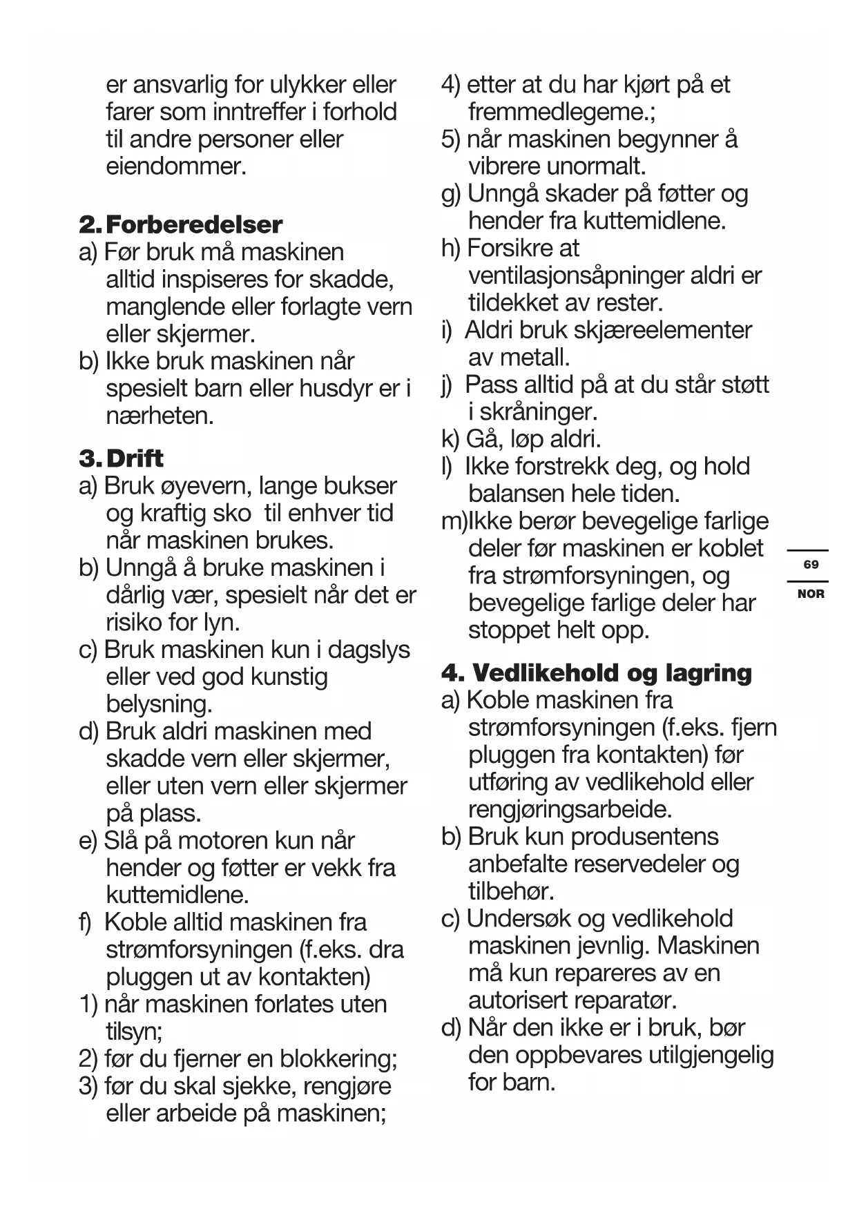 a) Les anvisningene grundig. Bli kjent med kontrollene og bruken av maskinen. b) La aldri barn, personer med reduserte fysiske, sensoriske eller mentale evner eller mangel på erfaring og kunnskap, eller personer som ikke kjenner til disse instruksjonene bruke maskinen, lokale bestemmelser kan sette grenser for alder på operatør. c) Operatøren eller brukeren69 NOR er ansvarlig for ulykker eller farer som inntreffer i forhold til andre personer eller eiendommer.