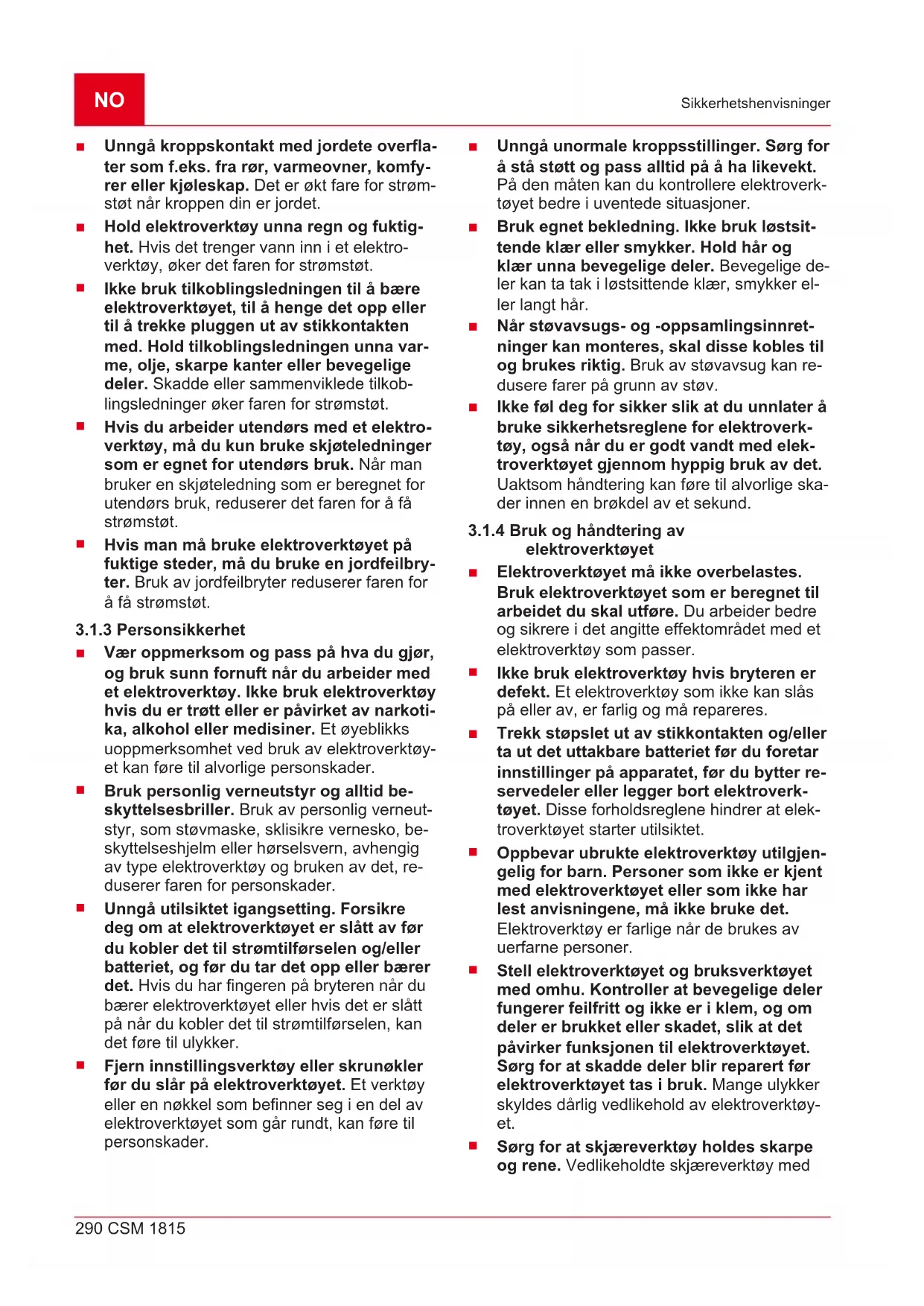 Støpselet på elektroverktøyet må passe inn i stikkontakten. Pluggen må ikke for- andres på noen som helst måte. Ikke bruk adapterplugger sammen med elektroverk- tøy som er jordet. Plugger som ikke er for- andret og stikkontakter som passer reduserer faren for elektrisk støt.NO 290 CSM 1815 Sikkerhetshenvisninger