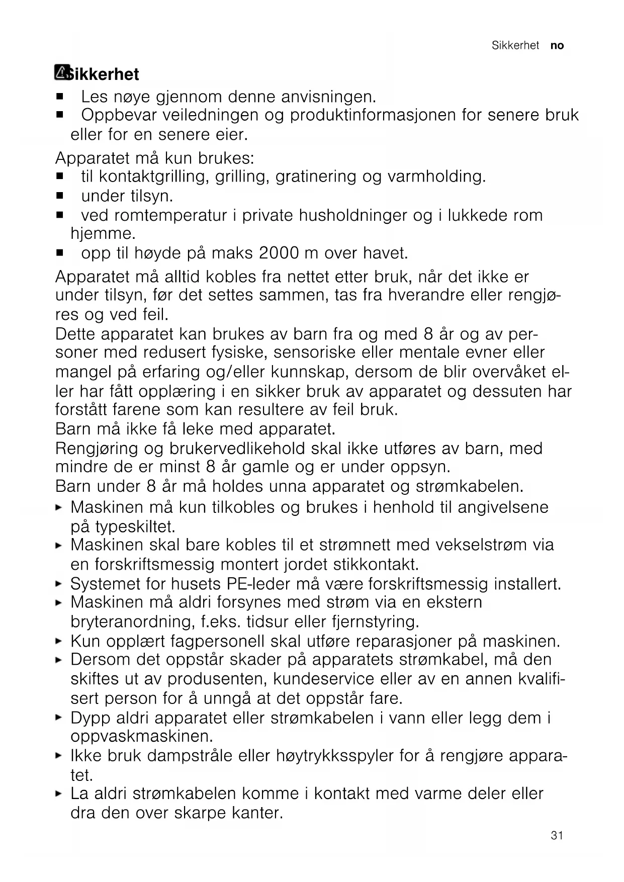 Rengjør grillplatene når grillen er helt av- kjølt. Merk: En liten grad av røykutvikling eller luktdannelse er normalt under første gangs bruk. BetjeningBetjening Generell informasjon Følg instruksjonene for å kunne bruke ap- paratet optimalt. Gni grillplatene inn med litt matolje på oversiden før bruk. Bruk matolje med høyt røykpunkt, f.eks. raffinert solsikkeolje. Vent med å legge matvarer på grillpla- tene til forhåndsinnstilt temperatur er nådd og kontrollampen har gått ut. 32Oversikt over rengjøring no Ta matvarene ut av kjøleskapet minst 30minutter før grillingen og la dem komme opp i romtemperatur. Dypfryste matvarer skal tines helt opp og tørkes av før grilling. Vent med å krydre kjøtt og fisk til etter at de er grillet. Acrylamid er helseskadelig og dannes når du tilbereder kornprodukter og potet- produkter på svært høy varme. Ikke grill matvarene så de blir for mørke, og fjern brente rester. Grilling med kontaktgrill Grill matvarene jevnt fra undersiden og oppsiden. Den øvre grillplaten tilpasser seg tykkelsen på matvarene.