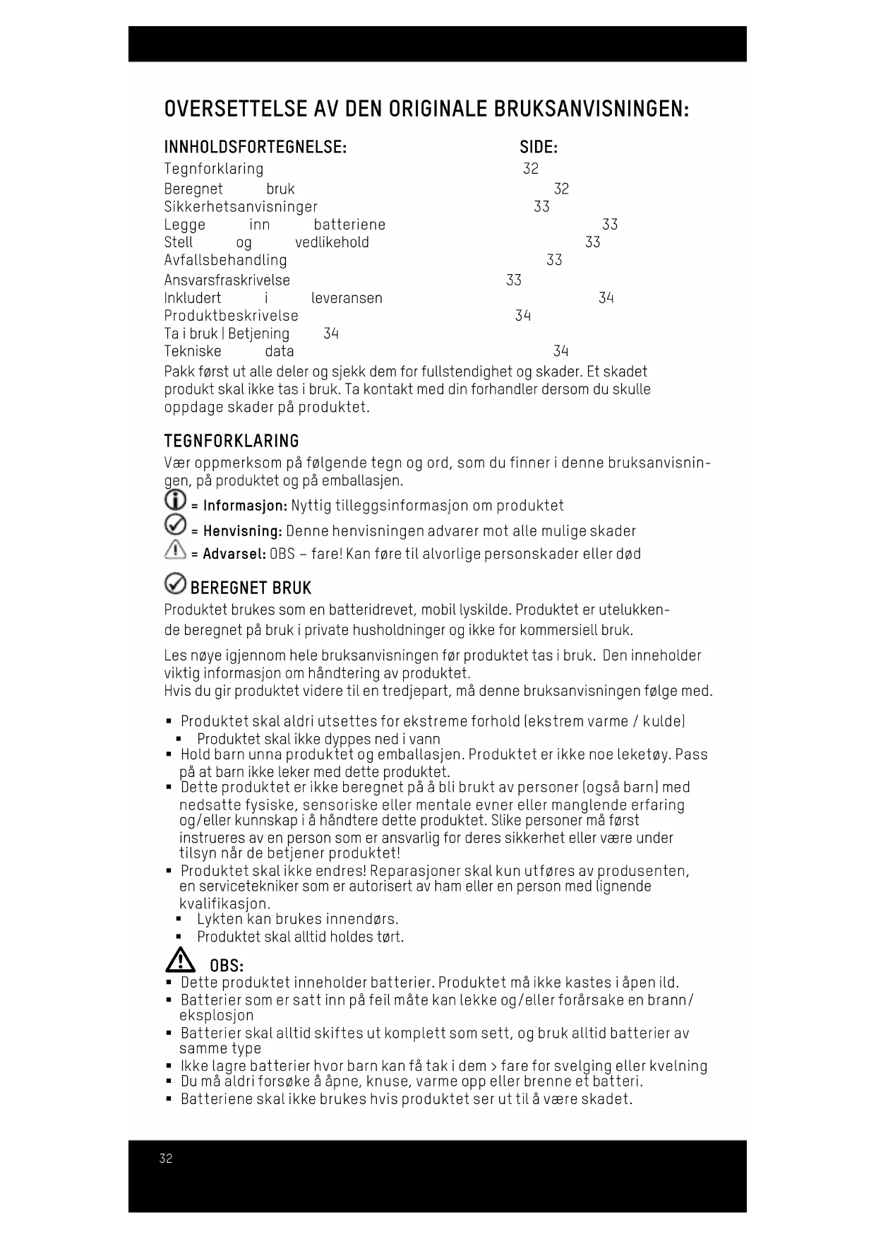 Rengjøring: § Koble produktet fra strømforsyningen før hver rengjøring. § Bruk bare en myk, tørr eller lett fuktet klut til rengjøring (eventuelt kan du tilføye et mildt § oppvaskmiddel). Under ingen omstendighet må du bruke skurepulver eller løsemidler til rengjøring. Vedlikehold: Når produktet ikke er i bruk, må du ta ut batteriene og oppbevare dem separat for å bevare levetiden. AVFALLSBEHANDLING Kasser den ubrukbare lykten i henhold til gjeldende nasjonale bestemmelser. Symbolet "søppeldunk" angir, at i EU skal elektrisk utstyr ikke kastes i vanlig husholdningsavfall. Bruk lokale retur- og innsamlingssystemer eller kontakt forhandleren der produktet ble kjøpt. Enheten skal leveres til et spesielt samlested for avfallsbehandling av gammelt utstyr. Ikke kasser enheten i hus- holdningsavfallet, da enheten inneholder batterier/oppladbare batterier. Derved oppfyller du dine lovbestemte plikter og yter ditt bidrag til miljøvern. ANSVARSFRASKRIVELSE Informasjon som gis i denne bruksanvisningen kan endres uten forutgående varsel. Vi overtar ikke ansvar for direkte, indirekte, tilfeldige eller andre skader eller følgeskader som er forårsaket av feil bruk eller manglende overholdelse av informasjonen i denne bruksanvisningen. Vi overtar ikke ansvar og oppfyller ingen garantikrav ved skader som skyldes feil bruk av produktet. Deutsch | English | Français | Español | Português | Svenska Italiano | Nederlands | Dansk | Suomi | Norsk34