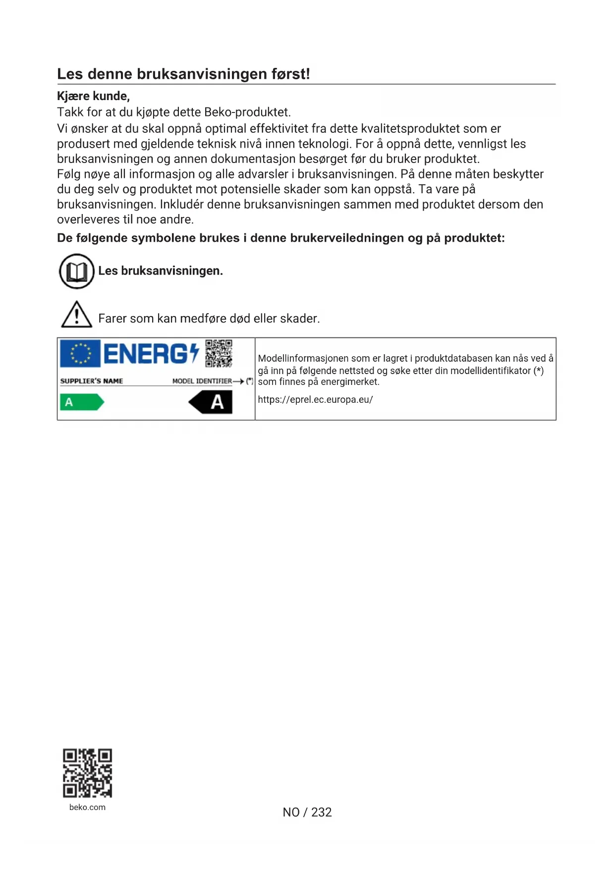 SVNO / 232 Les denne bruksanvisningen først! Kjære kunde, Takk for at du kjøpte dette Beko-produktet. Vi ønsker at du skal oppnå optimal effektivitet fra dette kvalitetsproduktet som er produsert med gjeldende teknisk nivå innen teknologi. For å oppnå dette, vennligst les bruksanvisningen og annen dokumentasjon besørget før du bruker produktet. Følg nøye all informasjon og alle advarsler i bruksanvisningen. På denne måten beskytter du deg selv og produktet mot potensielle skader som kan oppstå. Ta vare på bruksanvisningen. Inkludér denne bruksanvisningen sammen med produktet dersom den overleveres til noe andre. De følgende symbolene brukes i denne brukerveiledningen og på produktet: Les bruksanvisningen. Farer som kan medføre død eller skader. Modellinformasjonen som er lagret i produktdatabasen kan nås ved å gå inn på følgende nettsted og søke etter din modellidentifikator (*) som finnes på energimerket. https://eprel.ec.europa.eu/ beko.comNO / 233 Innholdsfortegnelse 1 Sikkerhetsinstruksjoner ................. 234